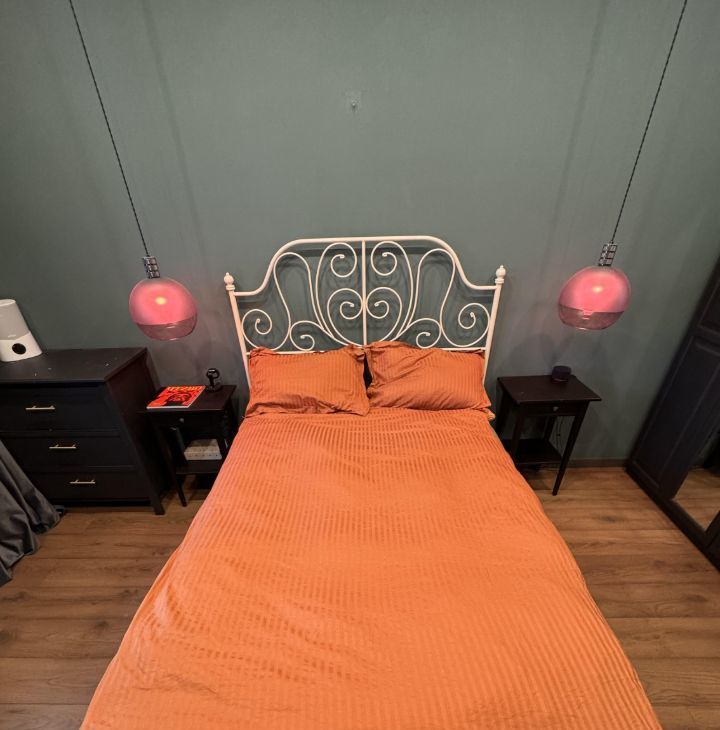 В спальне есть всё необходимое для комфортного отдыха и хранения вещей, установлены подвесные торшеры у прикроватных тумб.
