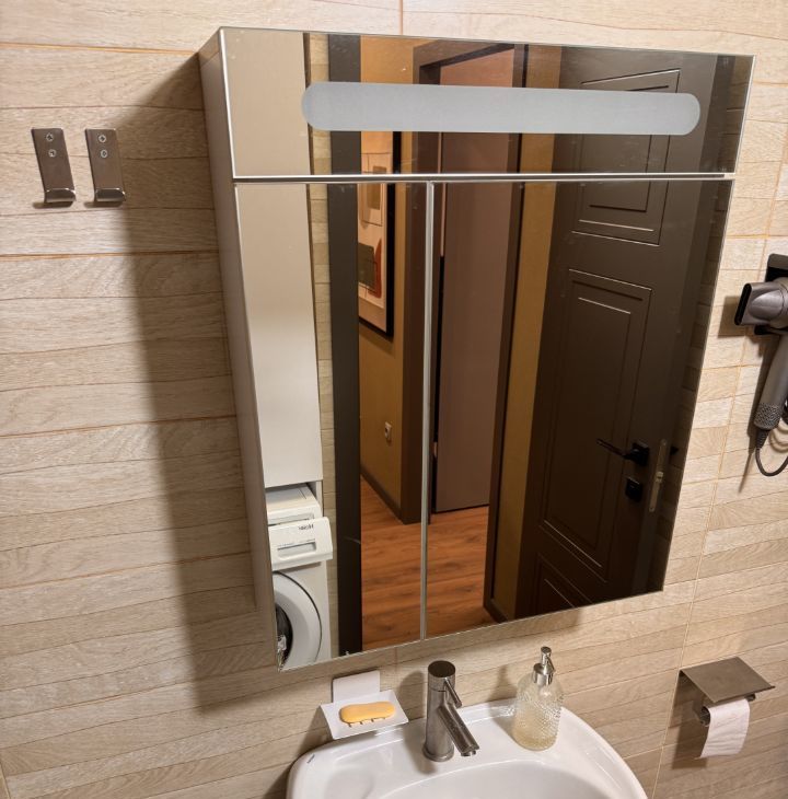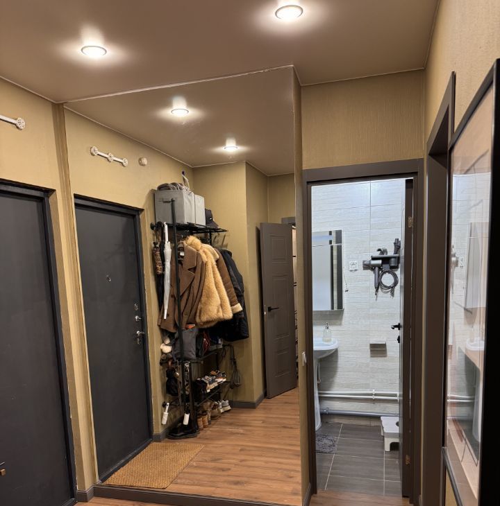 В коридоре установлено цельное большое зеркало 2,5 1,4 м, визуально расширяющее пространство и добавляющее света.