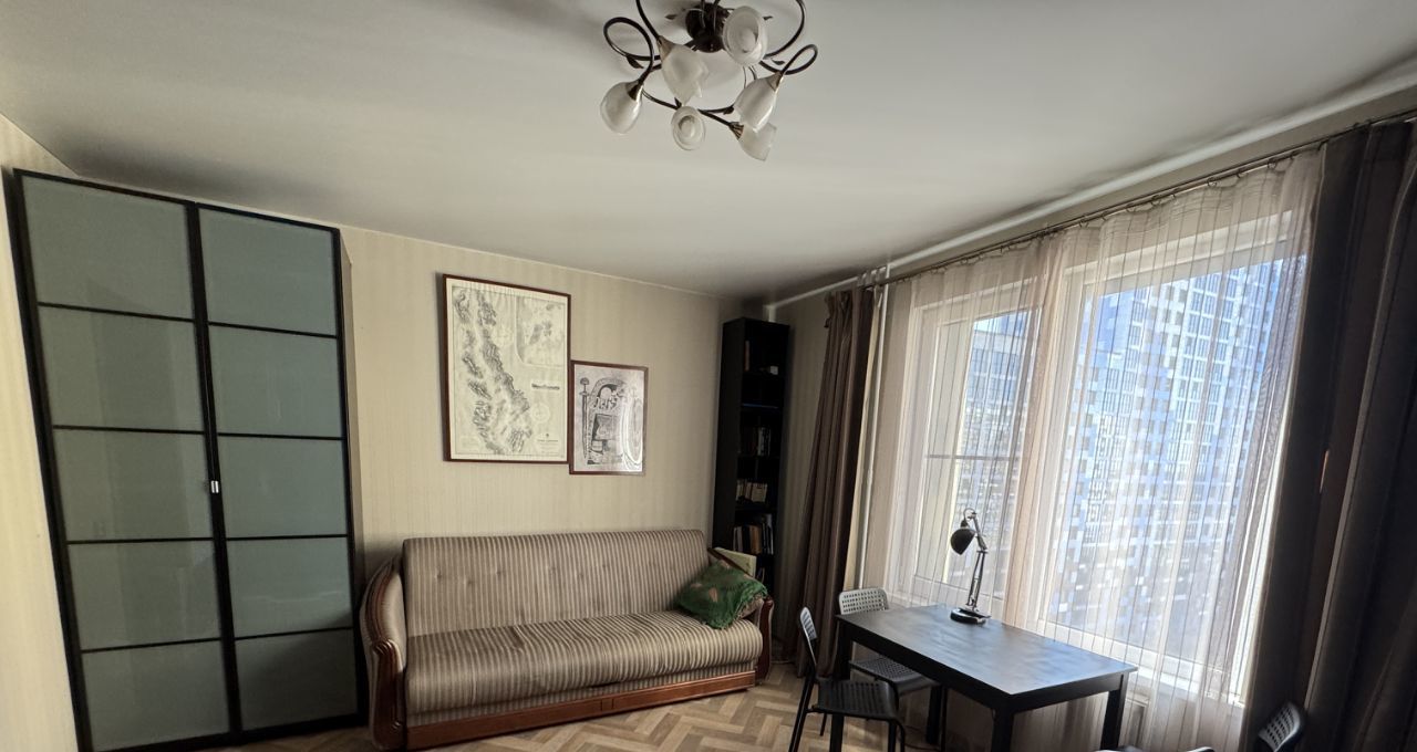 В кухне-гостиной установлена вместительная икеевская кухня, посудомойка, плита с духовкой, холодильник. Также в этой комнате есть удобный диван - полноценное спальное место для двух человек, стол, стулья.В спальне - кровать и шкаф дл одежды с зеркальными дверьми.