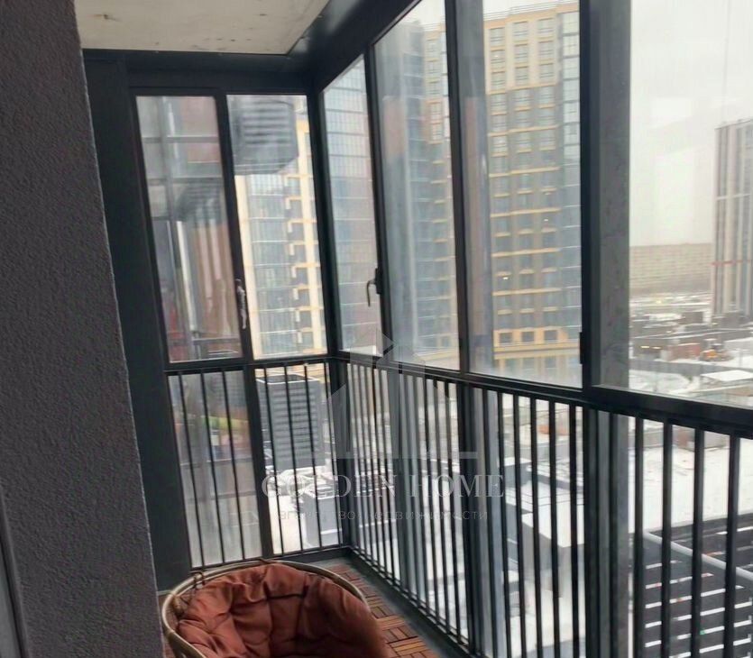 Большой балкон около 8 кв.м. с выходом из кухни-гостиной и спальни. На балконе установлено панорамное остекление, обустроена зона для отдыха со столиком и креслами.