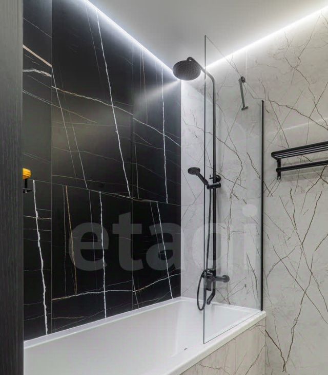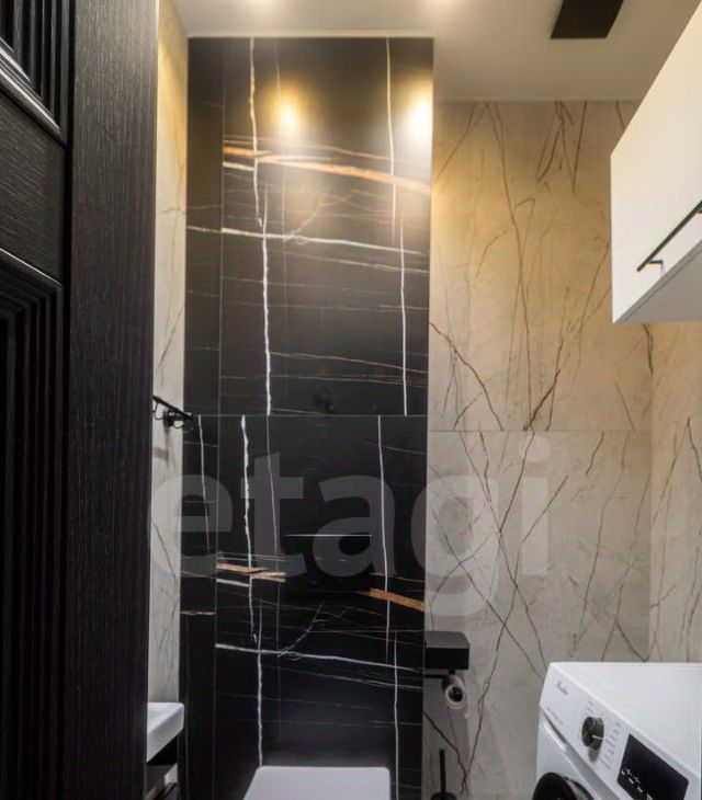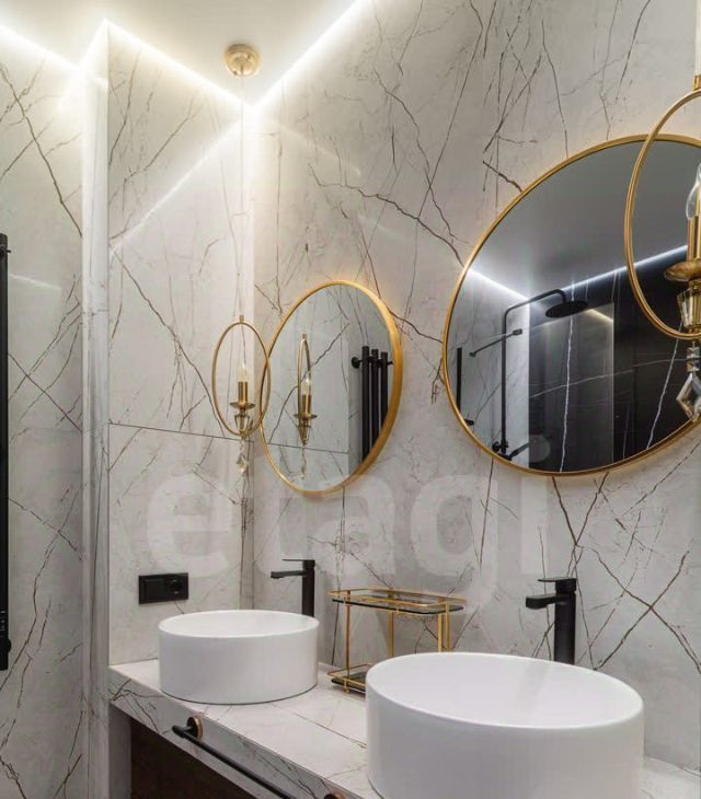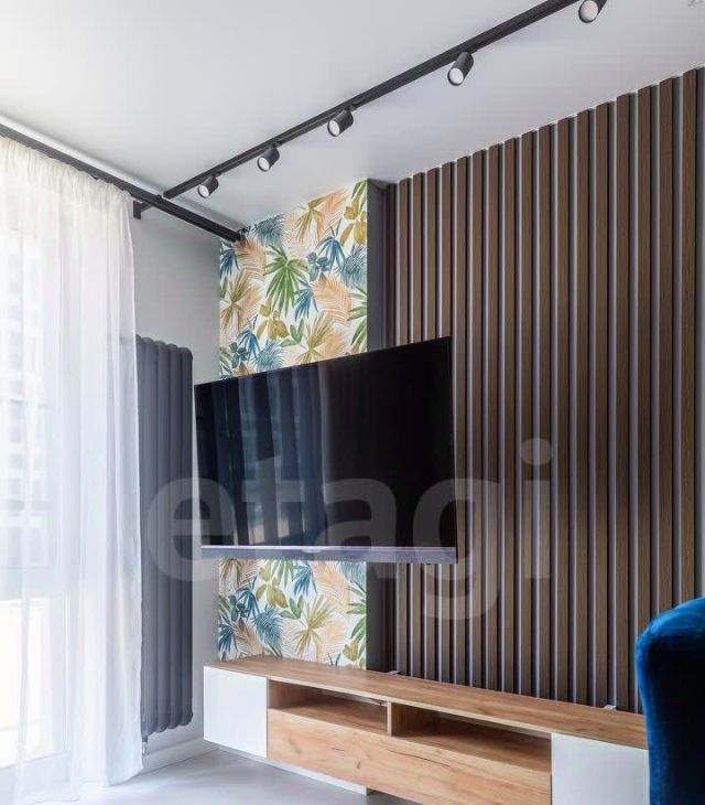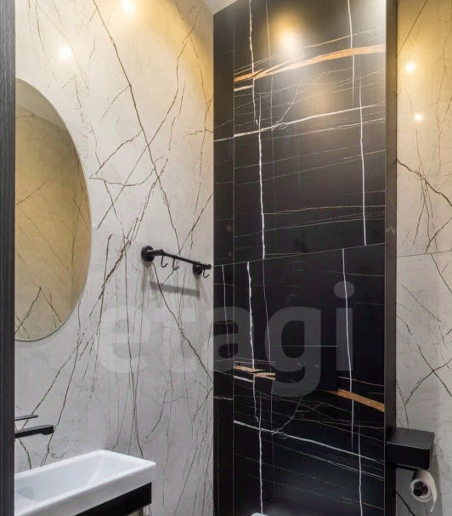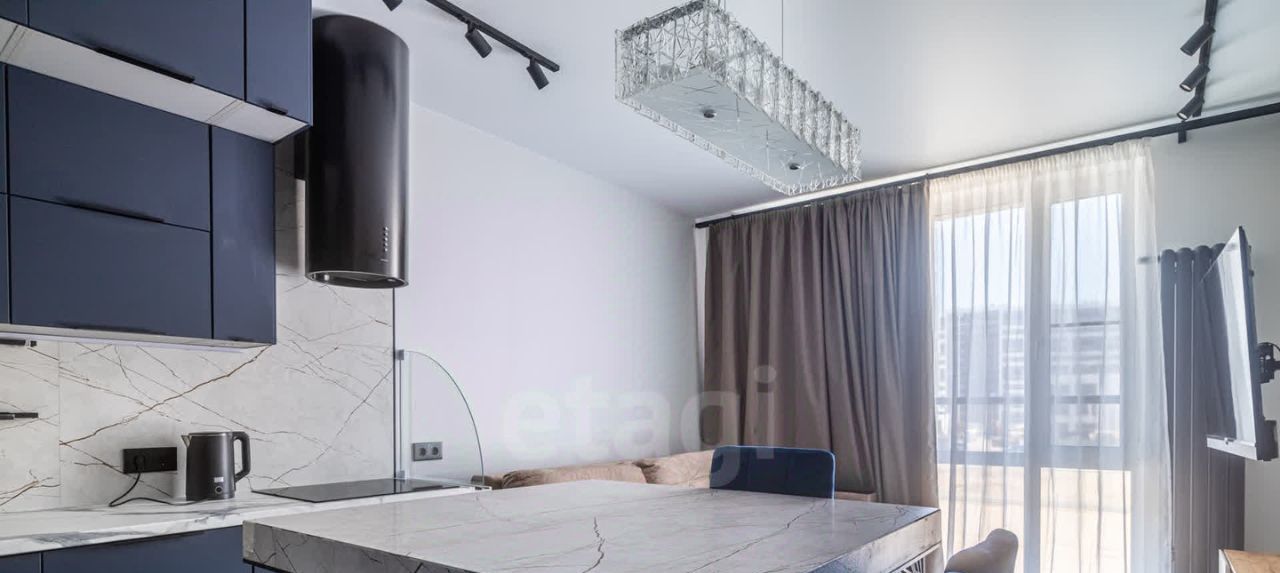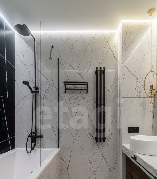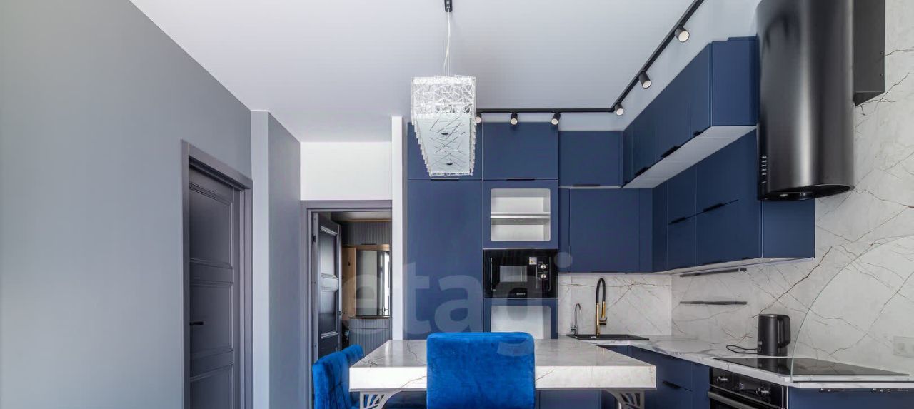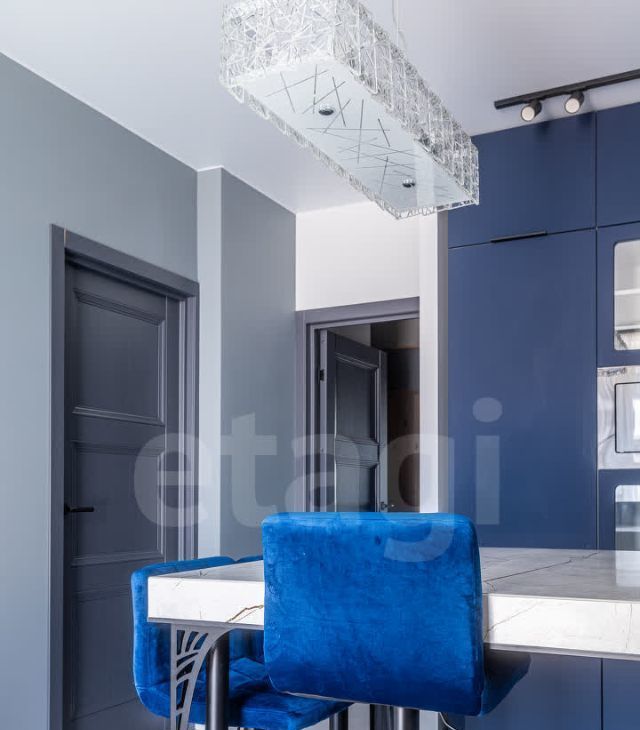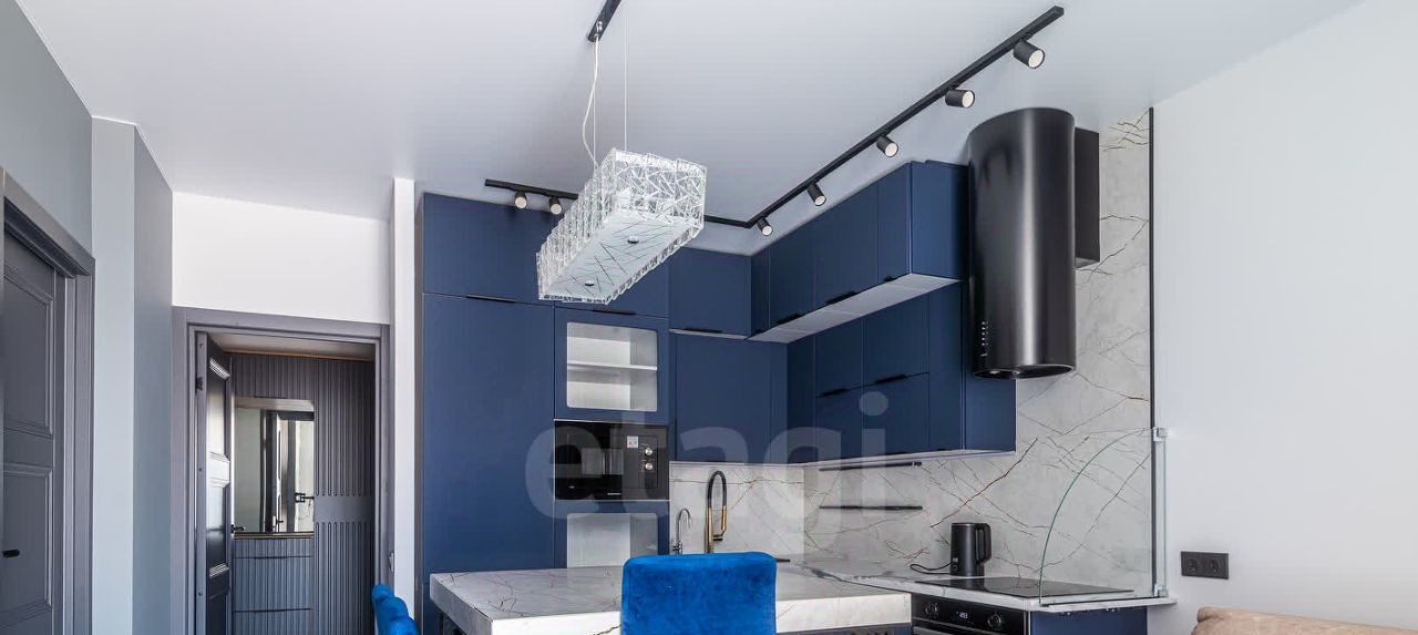 Яркое освещение с трековой системой и стильными люстрами наполняют пространство светом, а раздельный санузел с полноценной ванной добавляет комфорта.