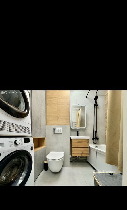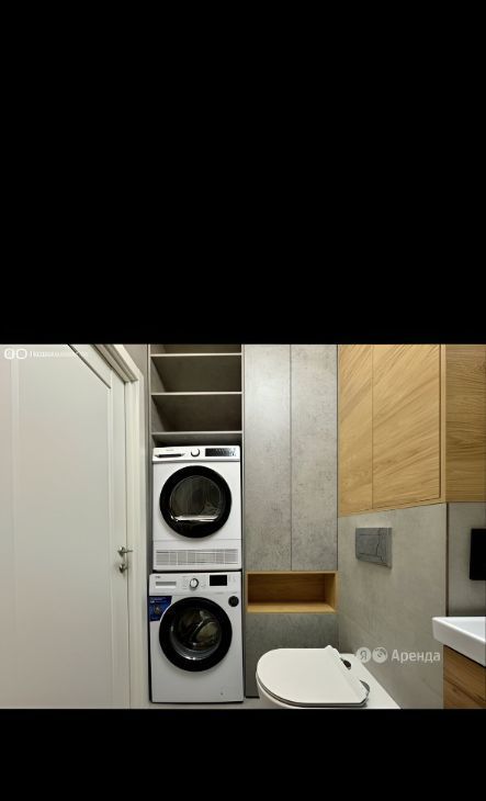 Санузел совмещённый с ванной комнатой. В ванной установлена стиральная машина автомат, сушильная машина, встроенные шкафы для хранения.