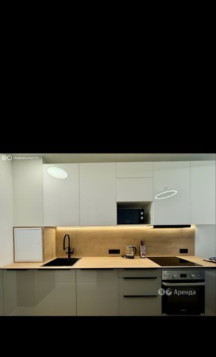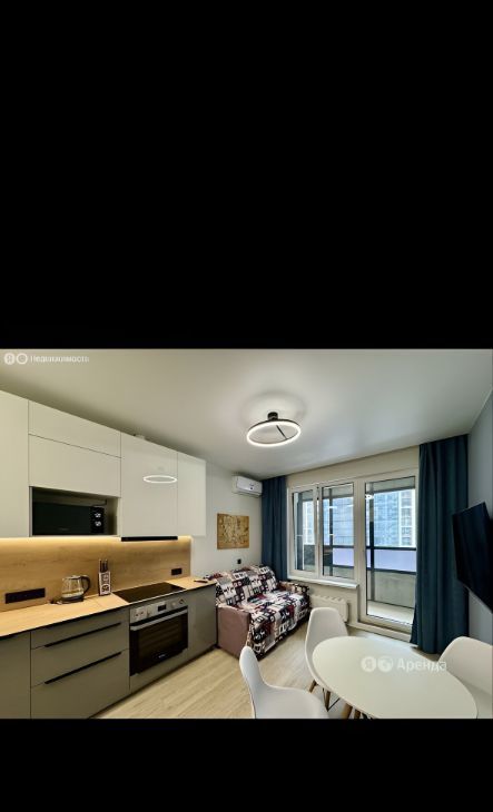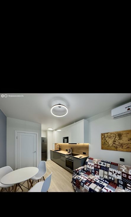Современная стильная кухня со встроенной варочной панелью, вытяжкой, большим холодильником, духовым шкафом, свч печью и посудомоечной машиной. Обеденная зона и уютный диван, чтобы расслабиться и посмотреть интересный фильм. Установлен кондиционер.