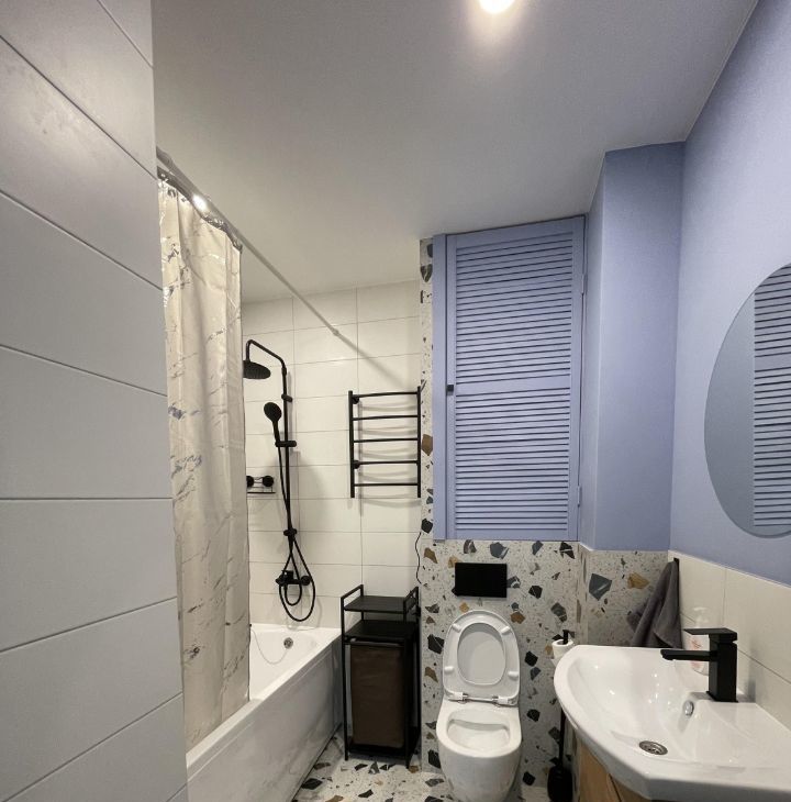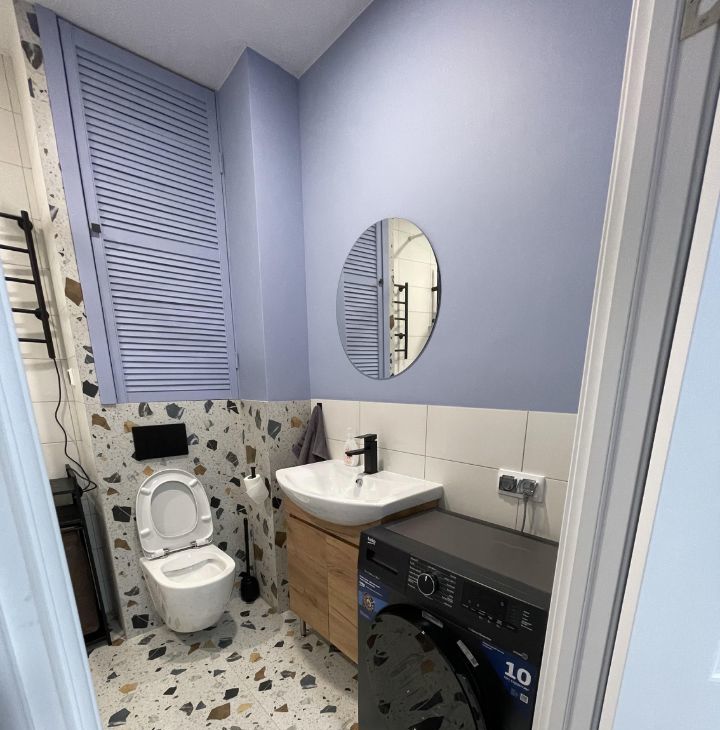 - Санузел: просторная ванная, инсталляция, широкая тумба с раковиной, зеркало, стиральная машина, электрические водонагреватель и полотенцесушитель, а также корзина для белья, для комфортной уборки есть пылесос.