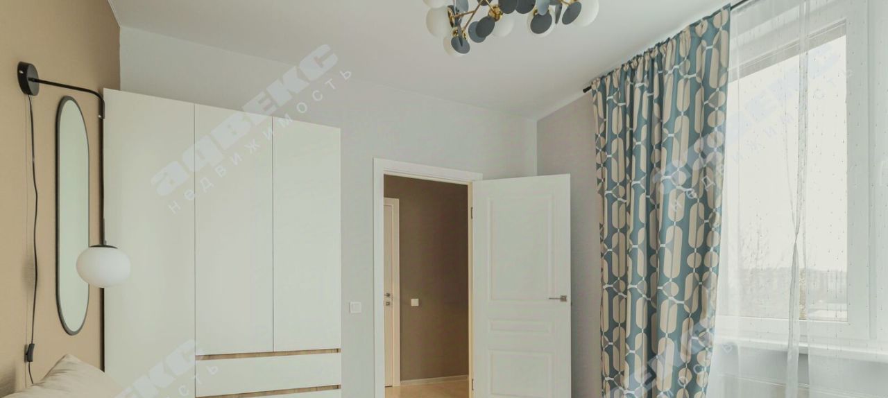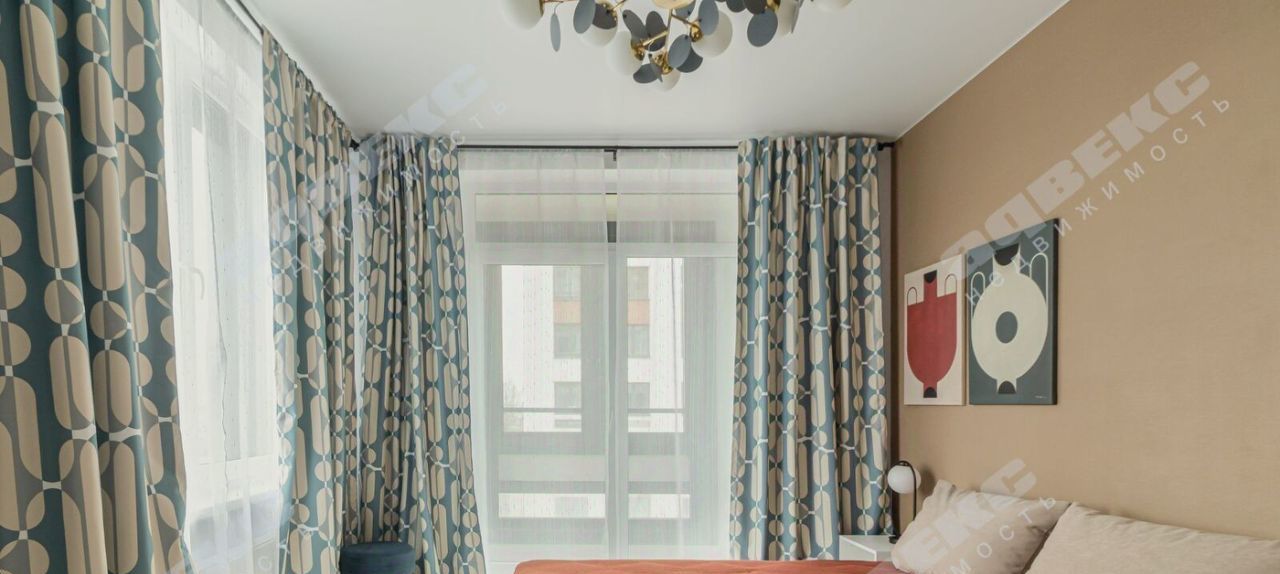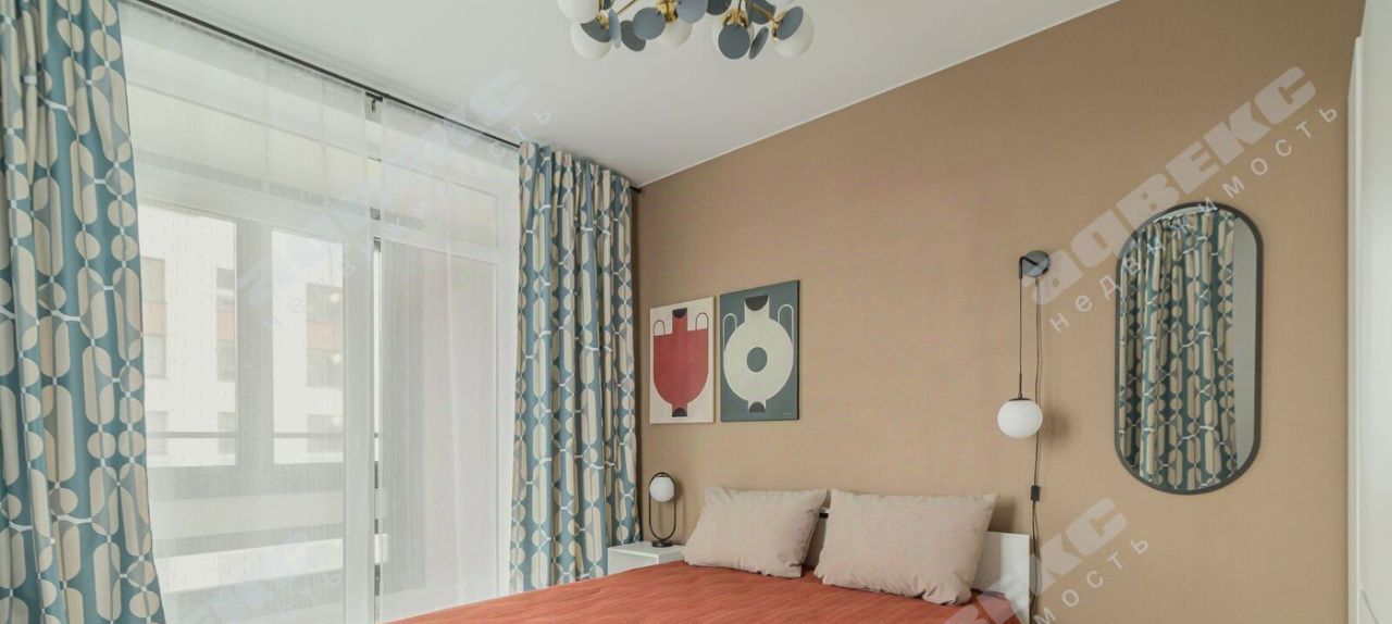 - В спальне: широкая двуспальная кровать с новым комфортным матрасом, шкаф для одежды, стильные светильники и плотные шторы, напольное покрытие.