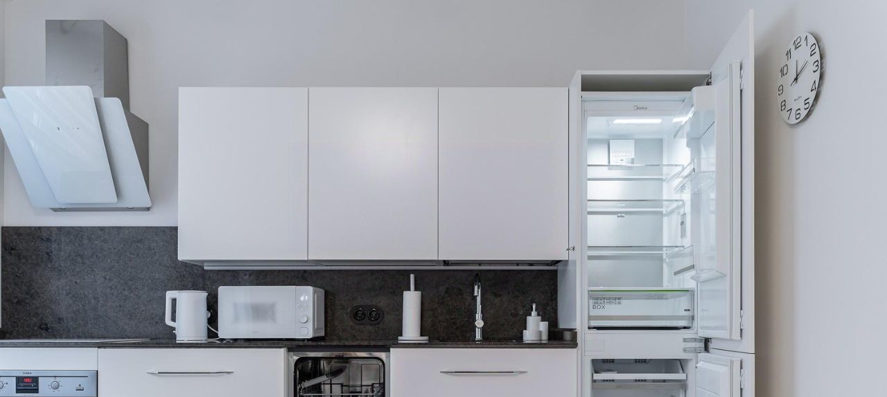 Светлая кухня в современном стиле: встроенная техника, аккуратная рабочая зона,