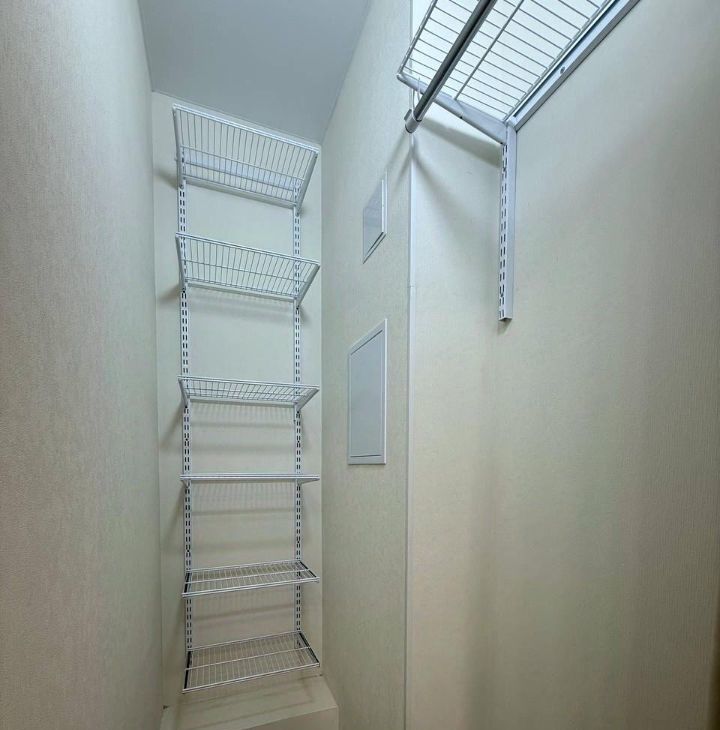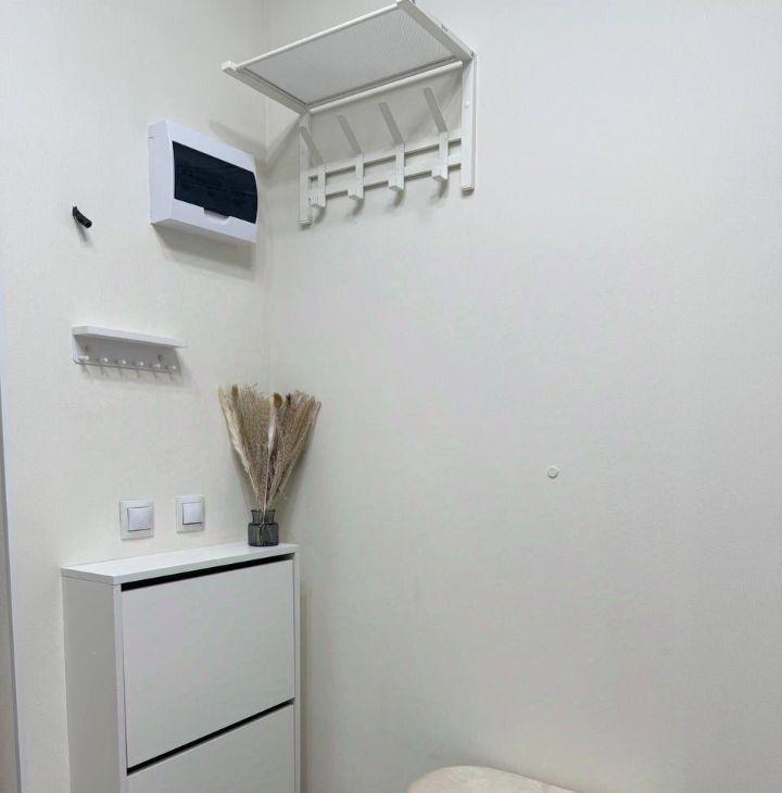 Прихожая оснащена настенной вешалкой, дизайнерским пуфом, обувницей и отдельной зоной хранения!