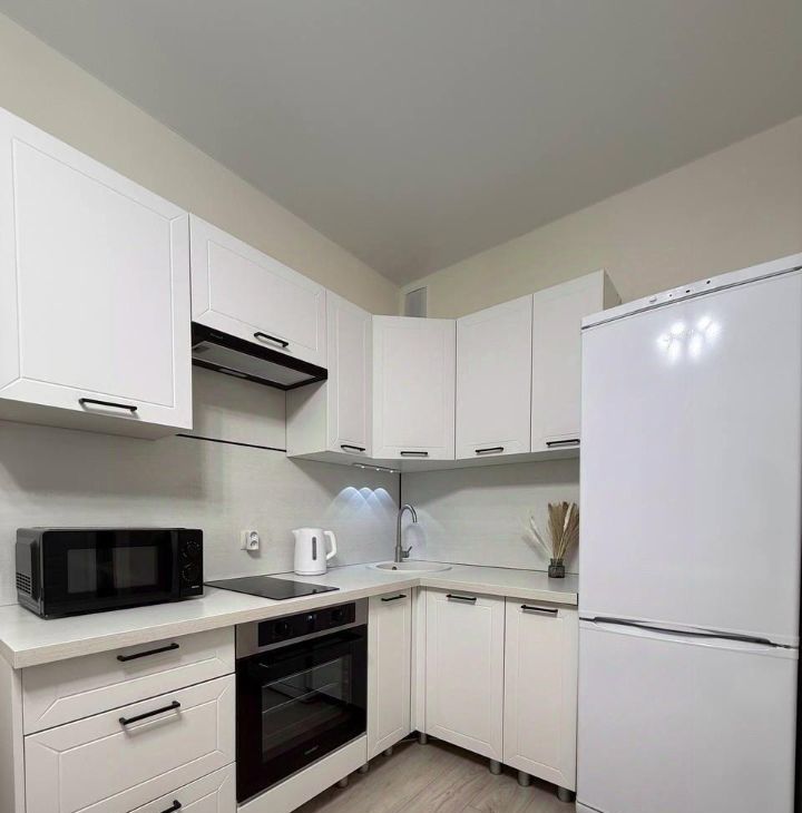1 зона: кухонный гарнитур со встроенной варочной панелью, духовкой, чайником, микроволновкой и вместительным холодильником.