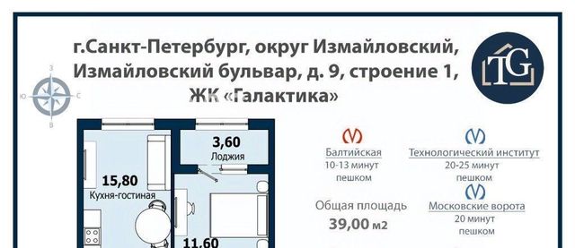 1-к кв. Санкт-Петербург бул. Измайловский, 9 (39.0 м²)