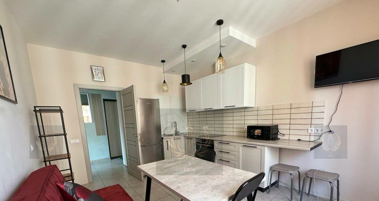 Внутри — полноценный комплект мебели и бытовой техники: комфортная кровать, вместительные шкафы, обеденная зона, диван, стиральная машина, холодильник, варочная панель, духовой шкаф, микроволновка, телевизор. Всё в отличном состоянии и тщательно подобрано для удобства арендаторов.