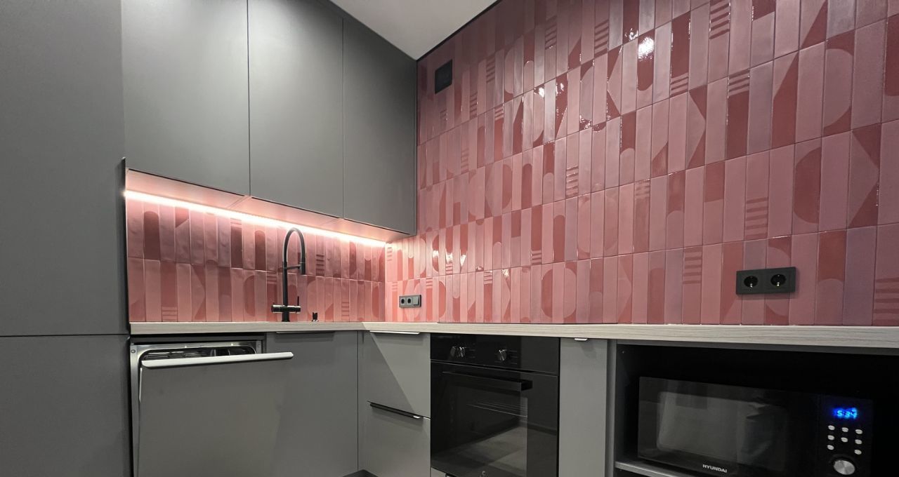 На кухне встроенный холодильник, посудомоечная машина, духовой шкаф, варочная поверхность и микроволновая печь.