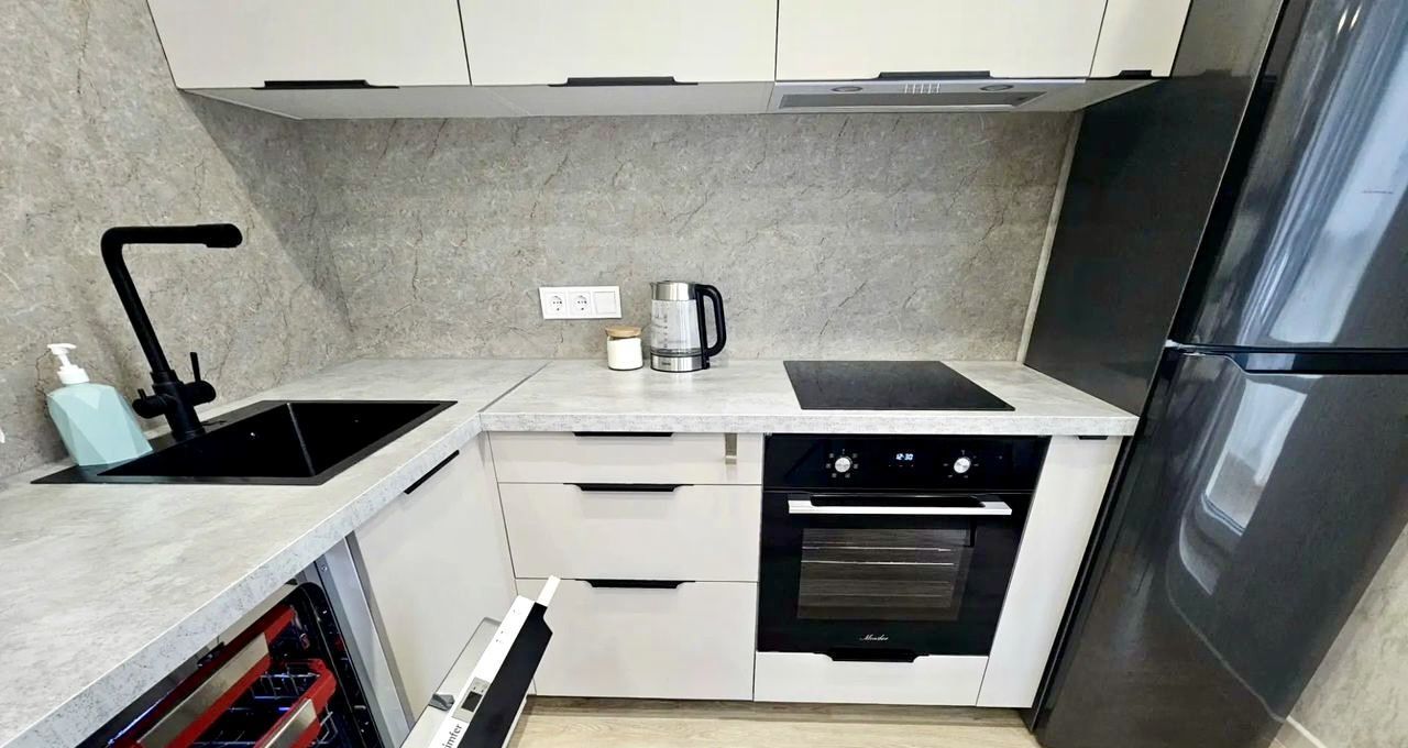 Полностью оборудованная современная кухня: индукционная варочная поверхность, духовой шкаф, посудомоечная машина, холодильник.