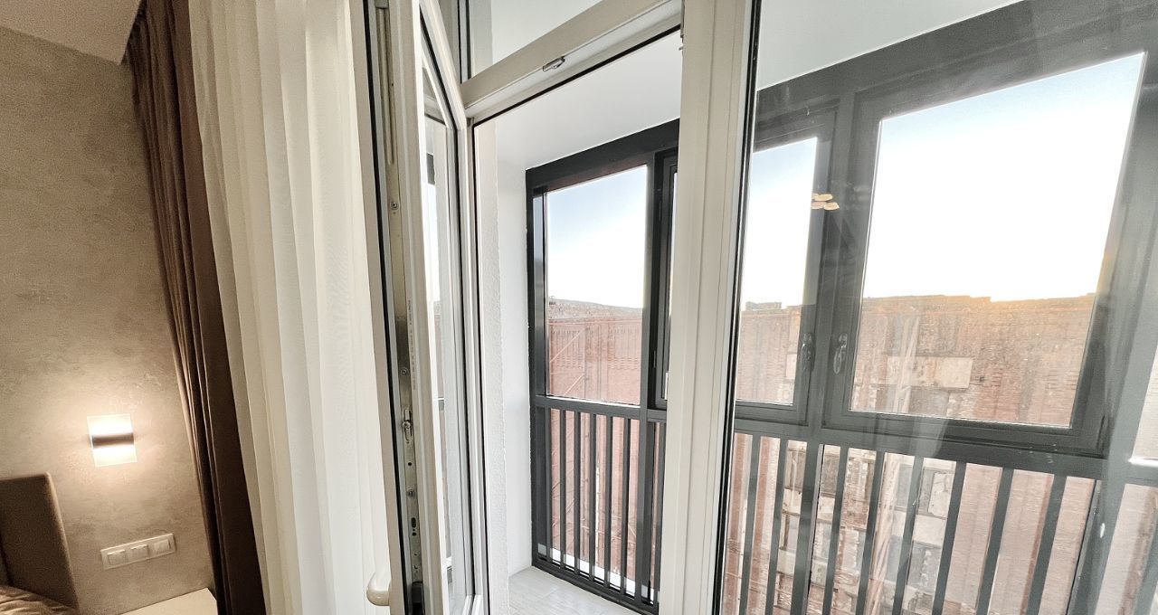 • Просторная кухнягостиная с французским балконом и панорамным остеклением