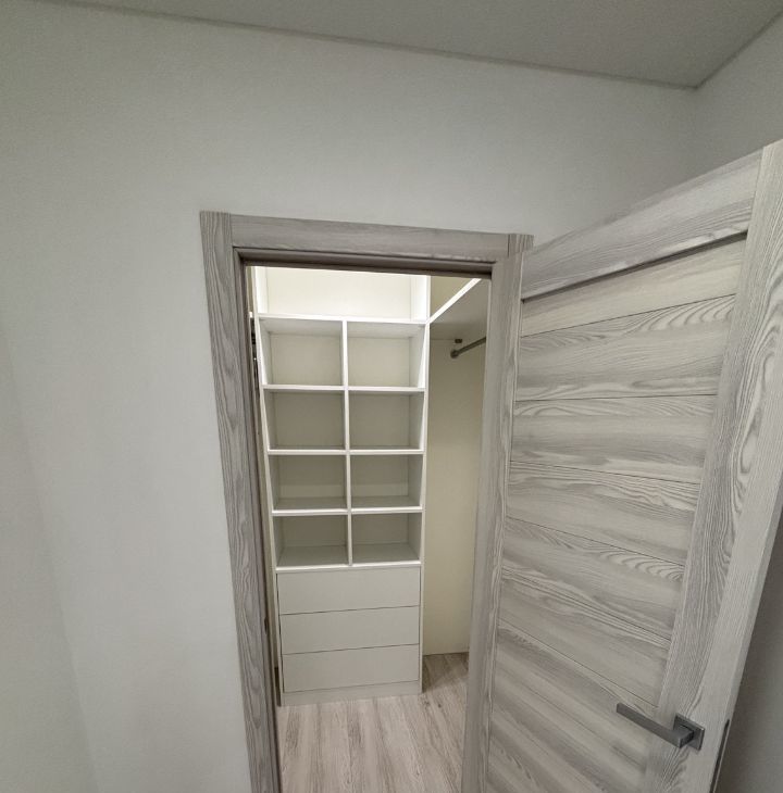 Общая площадь 43,4 м2. Кухня 10,8 м2; комната 17,3 м2; коридор 9,5 м2; гардеробная 1,81 м2.