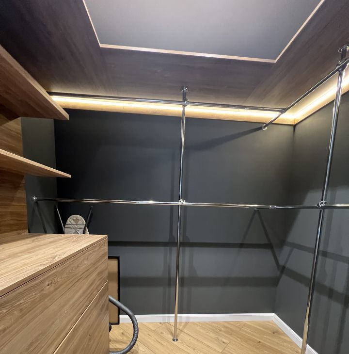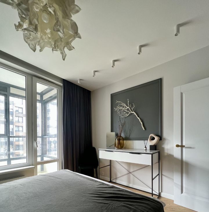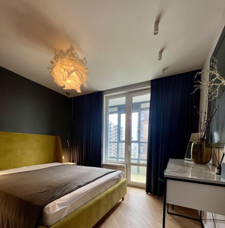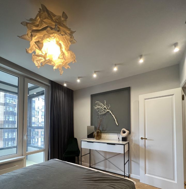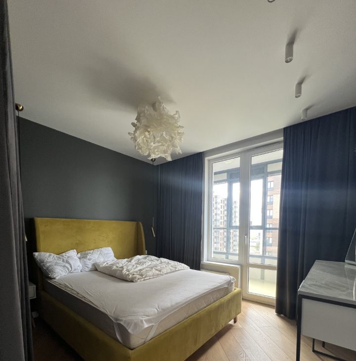 Спальня с выходом на лоджию и вместительной гардеробной. Продумана система освещения. Окна выходят во двор.