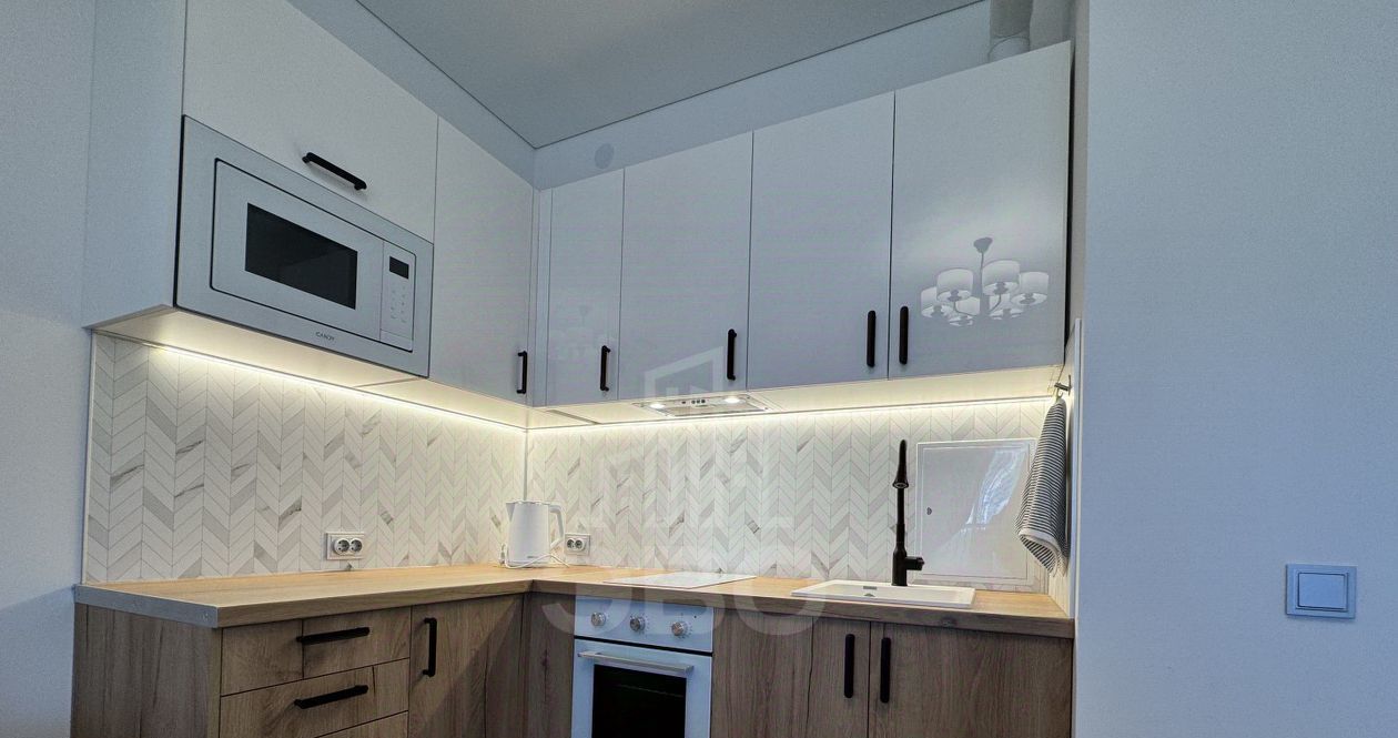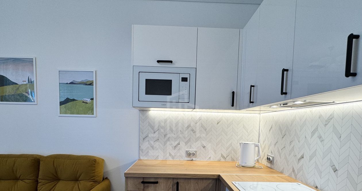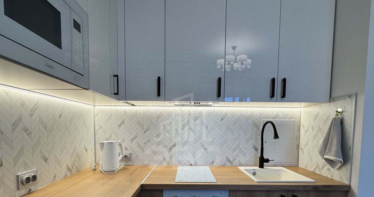 Кухонная зона оснащена современной встроенной техникой: индукционная варочная панель, духовой шкаф, вытяжка, микроволновая печь, холодильник, электрочайник.