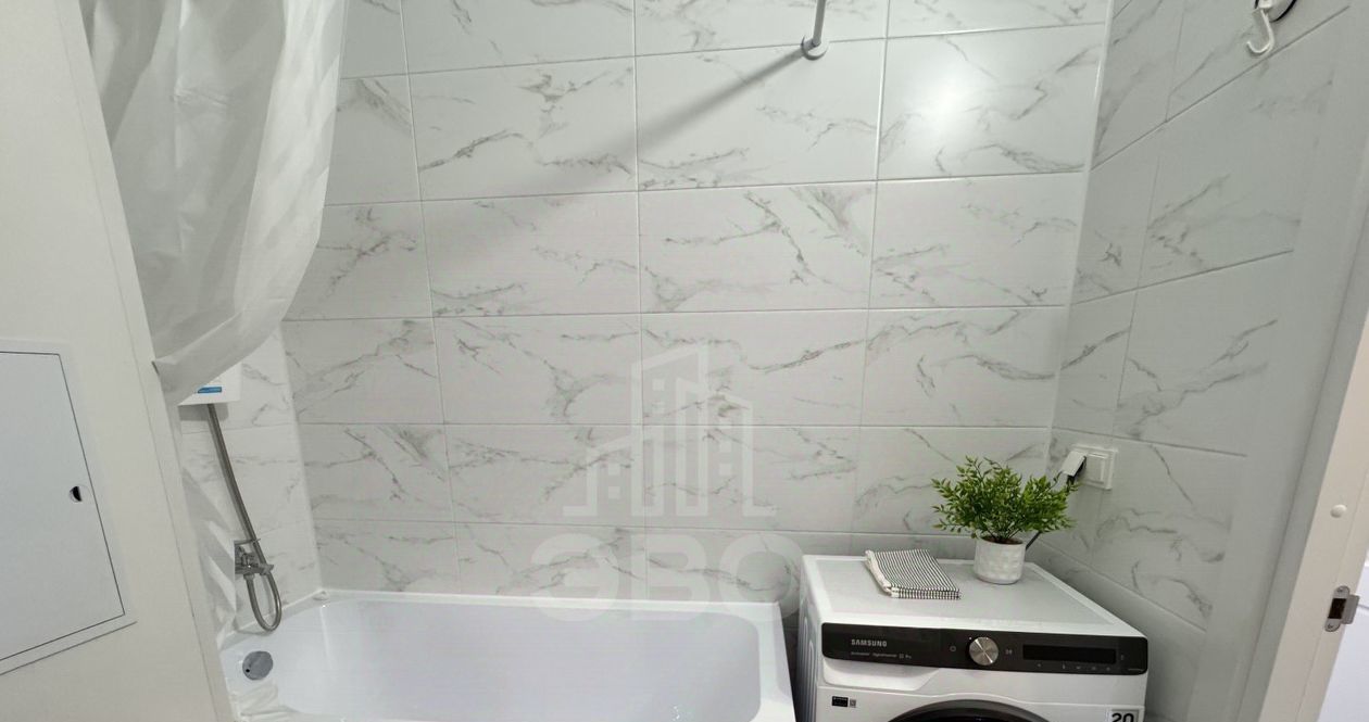 Смежный санузел с новой сантехникой и стиральной машиной.