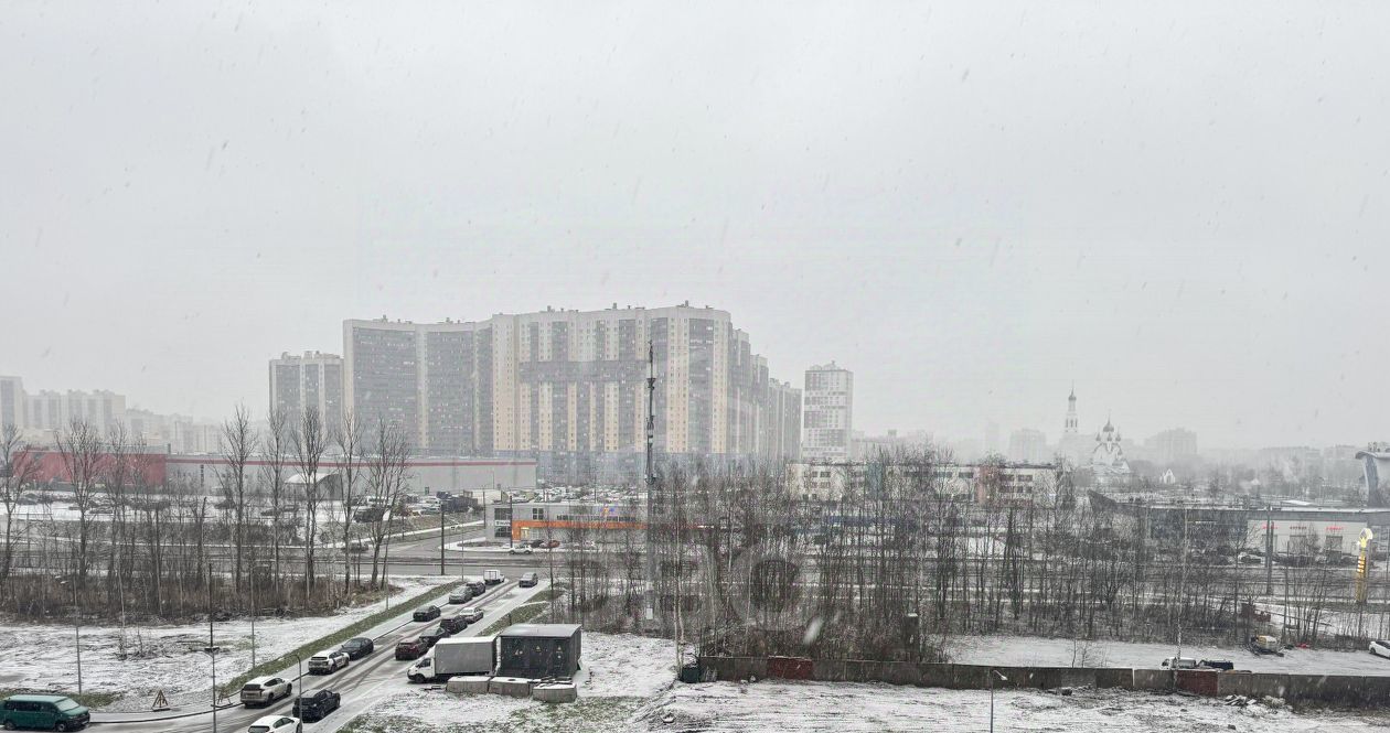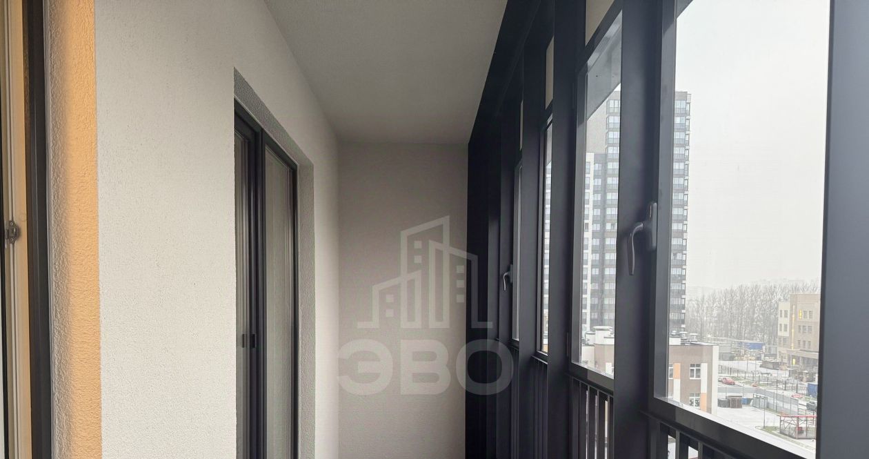 Огромная лоджия с панорамными окнами — шикарный вид на Дальневосточный проспект, пространство отлично подойдёт для зоны отдыха или кабинета.