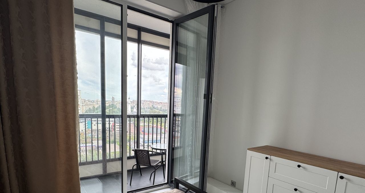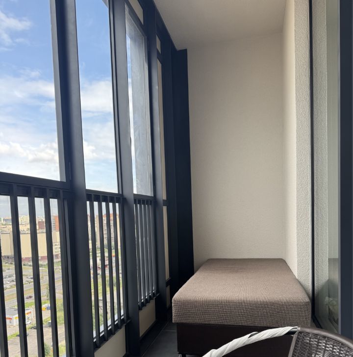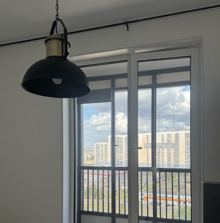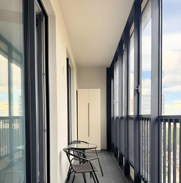 Балкон 9 кв.м, последний этаж с высокими потолками 3.1 м и алюминиевыми оконными рамами.