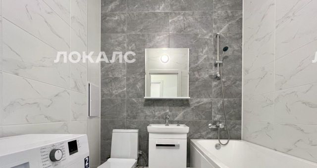 В ванной комнате: туалет, ванна, стиральная машина, раковина с зеркалом.