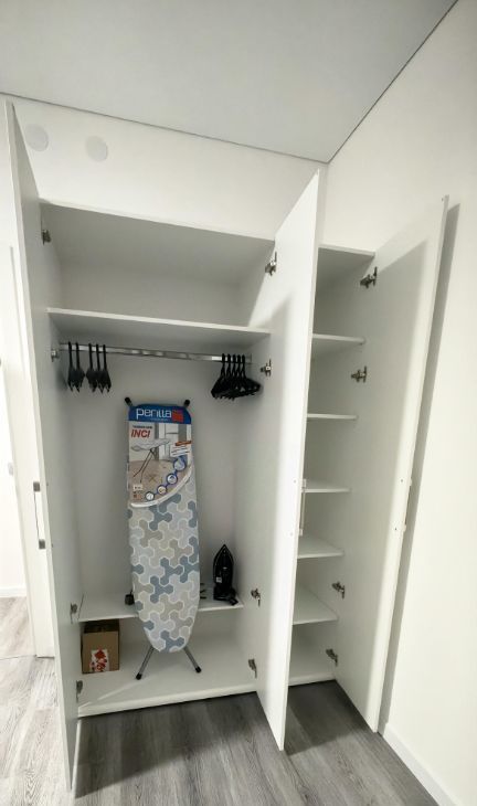 В комнате (16.3 кв.м) в наличии: шкаф для хранения вещей, кровать и две полочки, журнальный стол, гладильная доска, утюг, вешалки.
