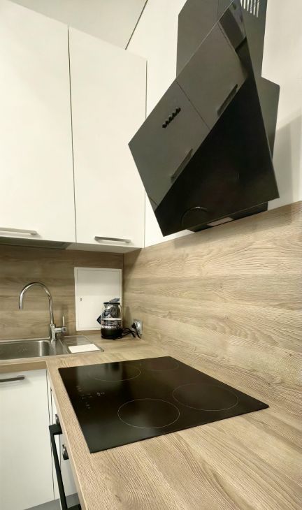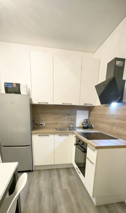 Кухня (10.8 кв.м) оборудована всей необходимой техникой и мебелью: холодильник, плита, микроволновая печь, посудомоечная машина,телевизор, стол, 4 стула, подвесной шкаф, диван (раскладной). Также в наличии посуда. На кухне панорамные окна с выходом на большой балкон (4.4 кв.м).