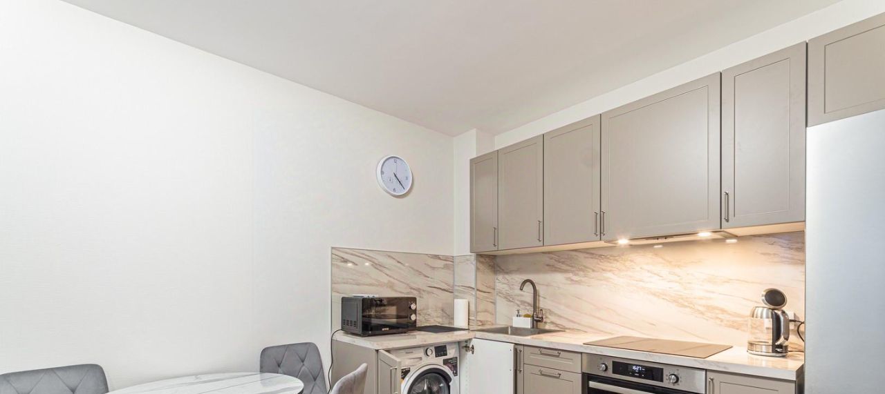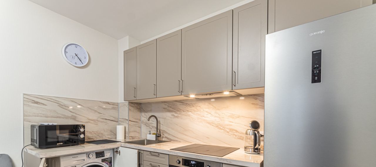 Большая кухня-гостиная, где размещён практичный гарнитур, варочная поверхность, духовой шкаф, СВЧ-печь, вытяжка, также есть полноразмерный холодильник, за дверцами боковой секции гарнитура установлена стиральная машина. В гостиной части - удобный диван, круглый обеденный стол и мягкие стулья.