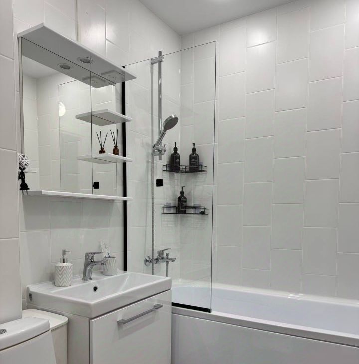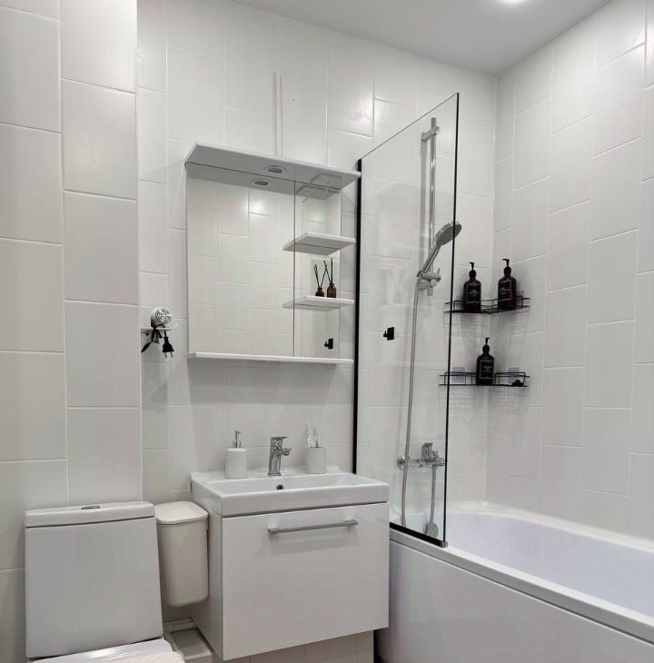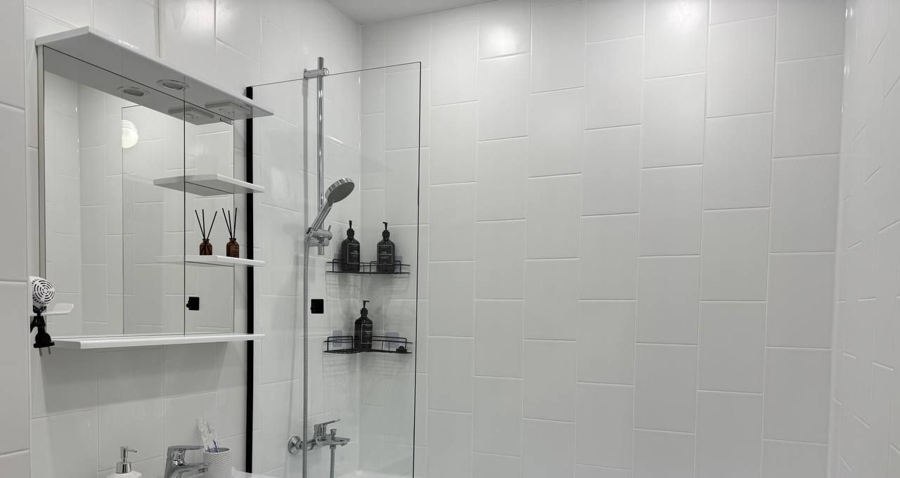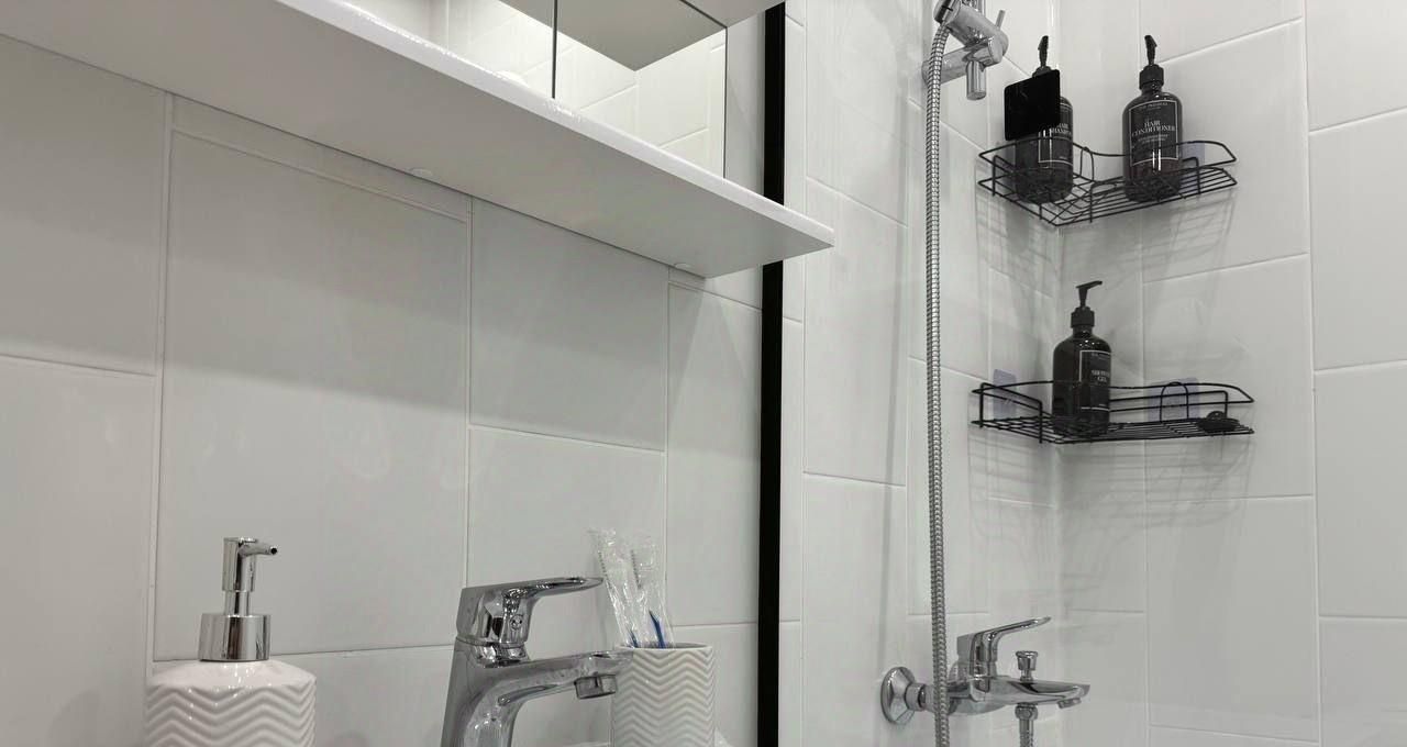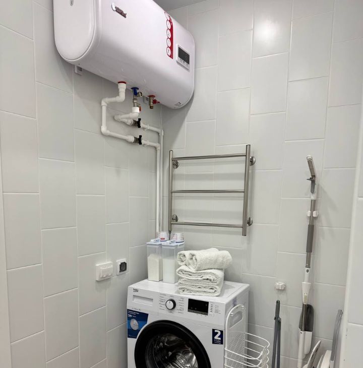 Ванная, водонагреватель, стиральная машина, чистые полотенца, мыло, шампунь/гель для душа, тапочки