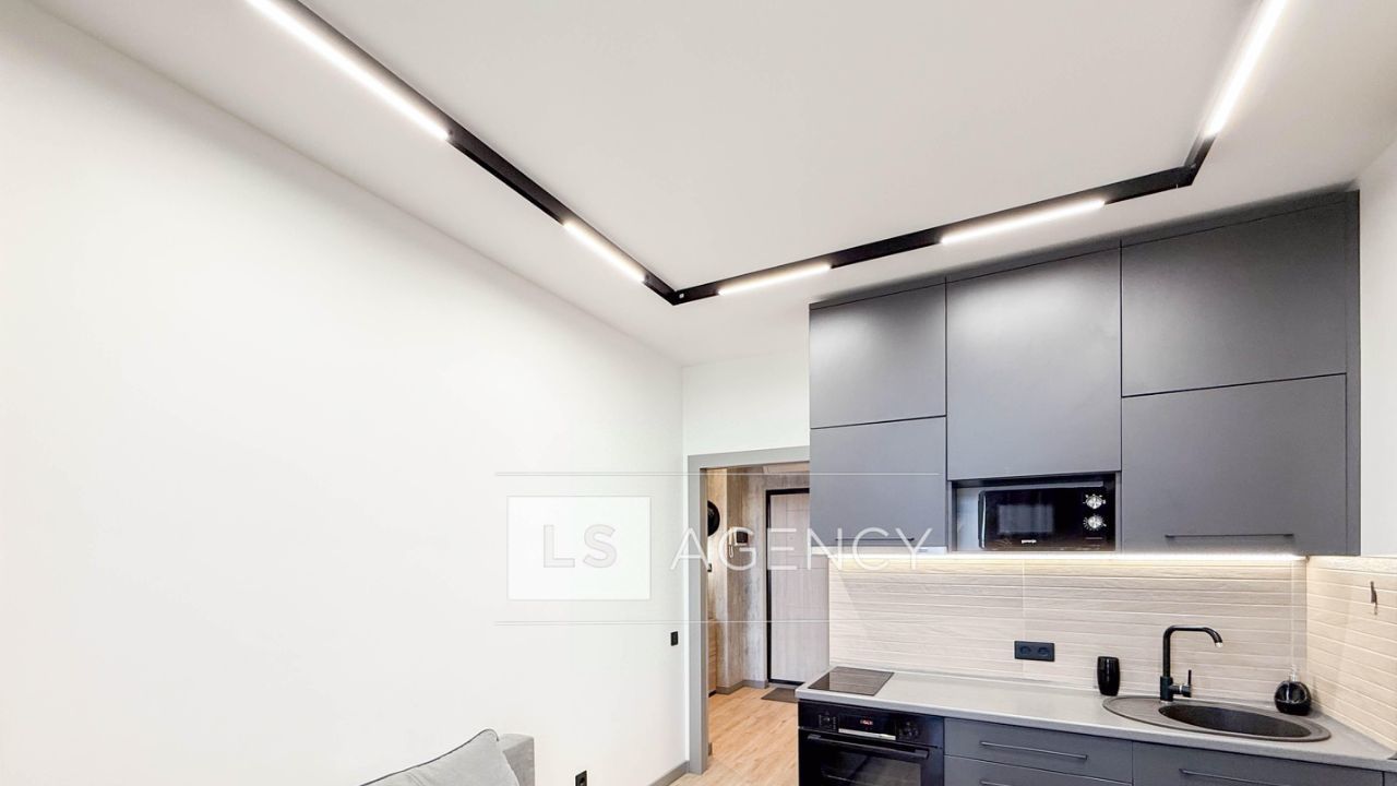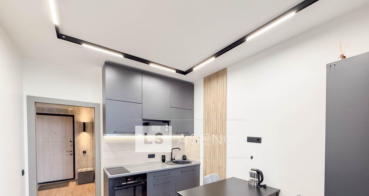 - кухня с индукционной плитой, духовым шкафом, СВЧ и холодильником