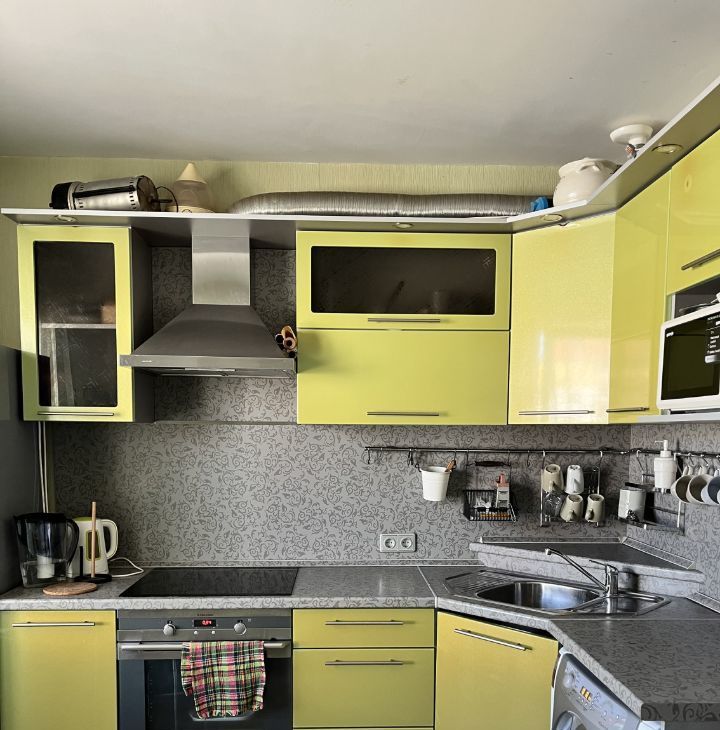 - кухня: весь гарнитур, холодильник, стиральная машинка, микроволновка + небольшой раскладываемый диванчик (1 одно спальное место для гостей)