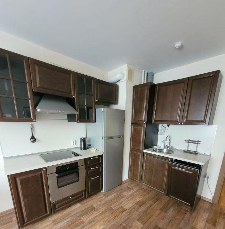 Квартира представляет собой евроформат, где присутствует просторная кухня-гостиная и уютная спальня. На кухне есть все из необходимой техники, включая посудомойку. Балкона нет. Дом стоит в глубине тихого двора.