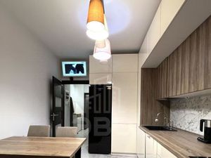 В квартире выполнен дизайнерский ремонт. Обстановка включает в себя всю необходимую мебель как в комнате, так и на кухне. Из техники имеется холодильник, посудомоечная и стиральная машины, а также телевизор. Санузел совмещенный, оборудован современной душевой кабиной. Окна выходят во двор, что обеспечивает тишину и комфорт.