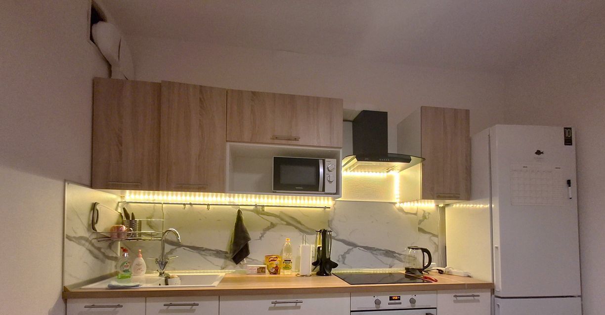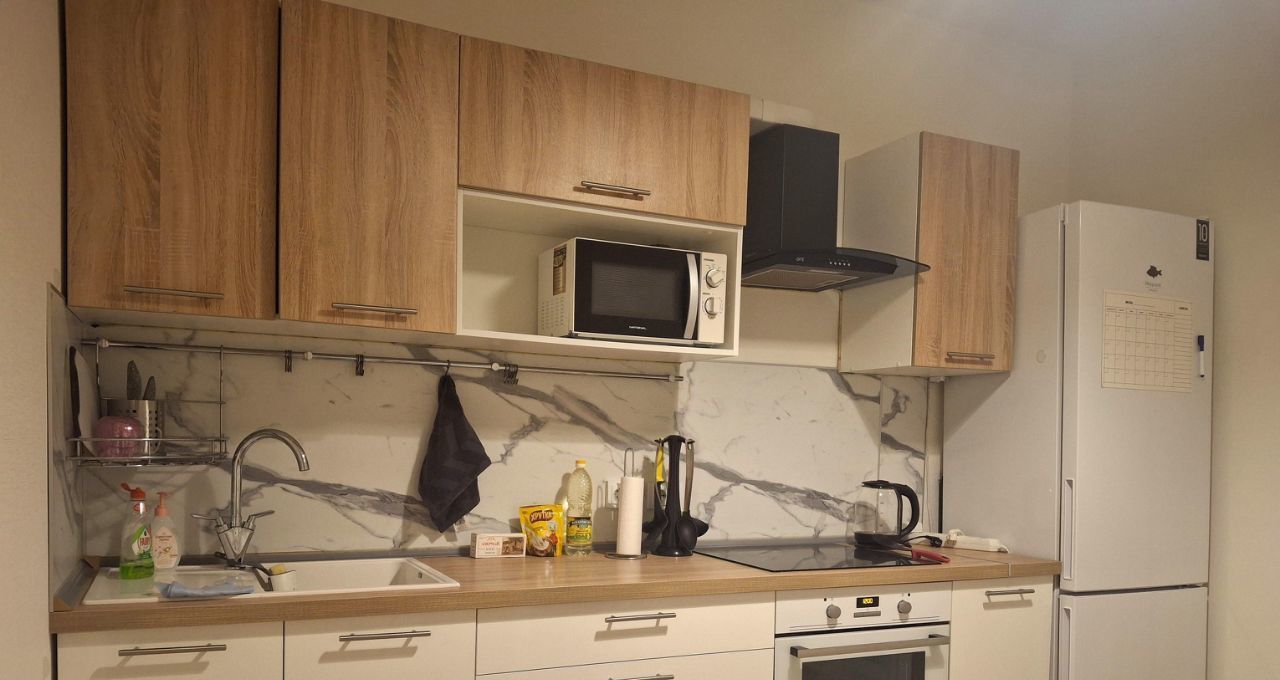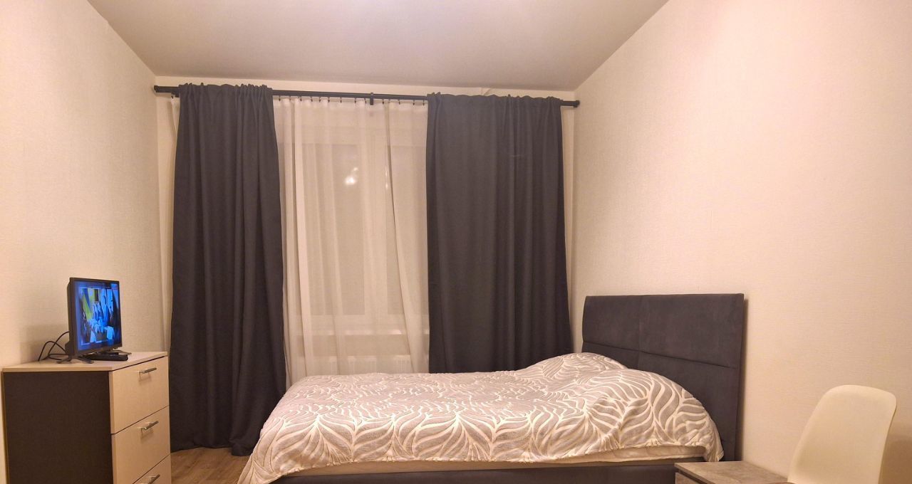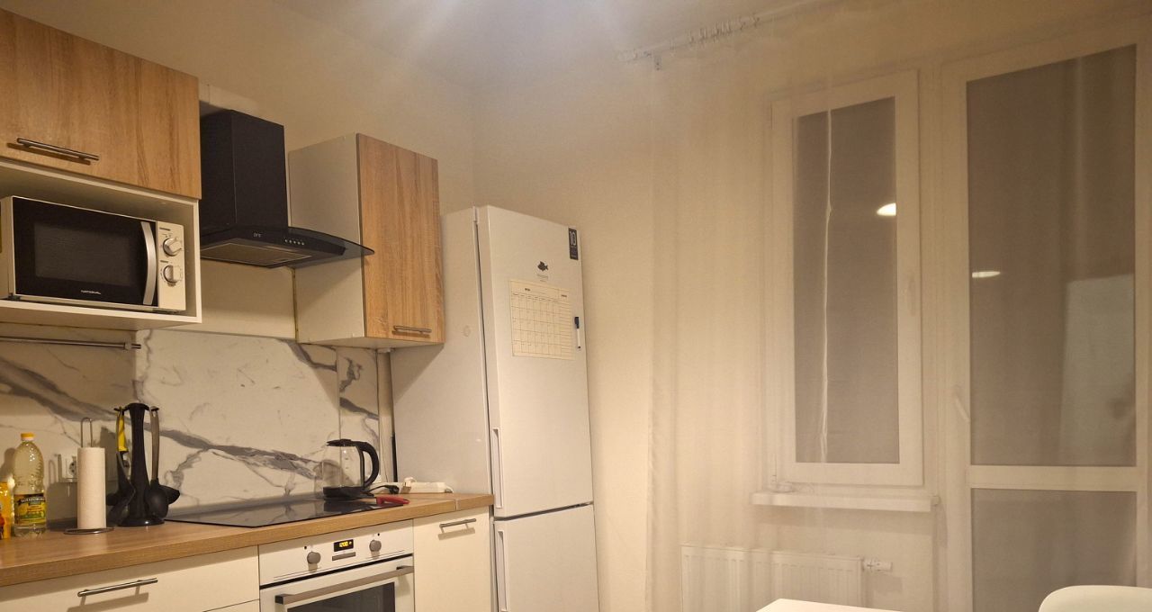 В квартире произведен качественный ремонт в светлых тонах, имеется вся необходимая мебель и бытовая техника. В комнате размещены двуспальная кровать с ортопедическим матрасом, шкаф для одежды, тумба, комод, телевизор, имеется достаточно места для детской кроватки, на окнах блэкаут шторы. Кухня просторная с выходом на застекленную лоджию, которая послужит местом отдыха. В кухне установлен кухонный гарнитур с варочной панелью, духовым шкафом, вытяжкой, а также двухкамерный холодильник и микроволновая печь, обеденный стол со стульями, имеется минимальный набор необходимой кухонной посуды.