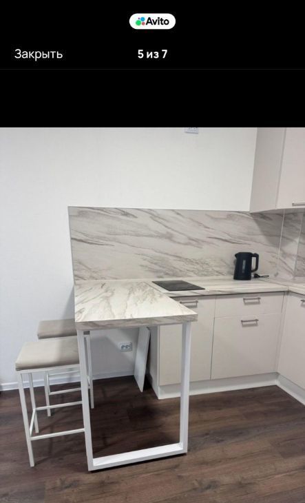 Кухня—гостинная : кухонный гарнитур , барная стойка, полу барные стулья ,холодильник , чайник,варочная панель , диван , тумба под тв