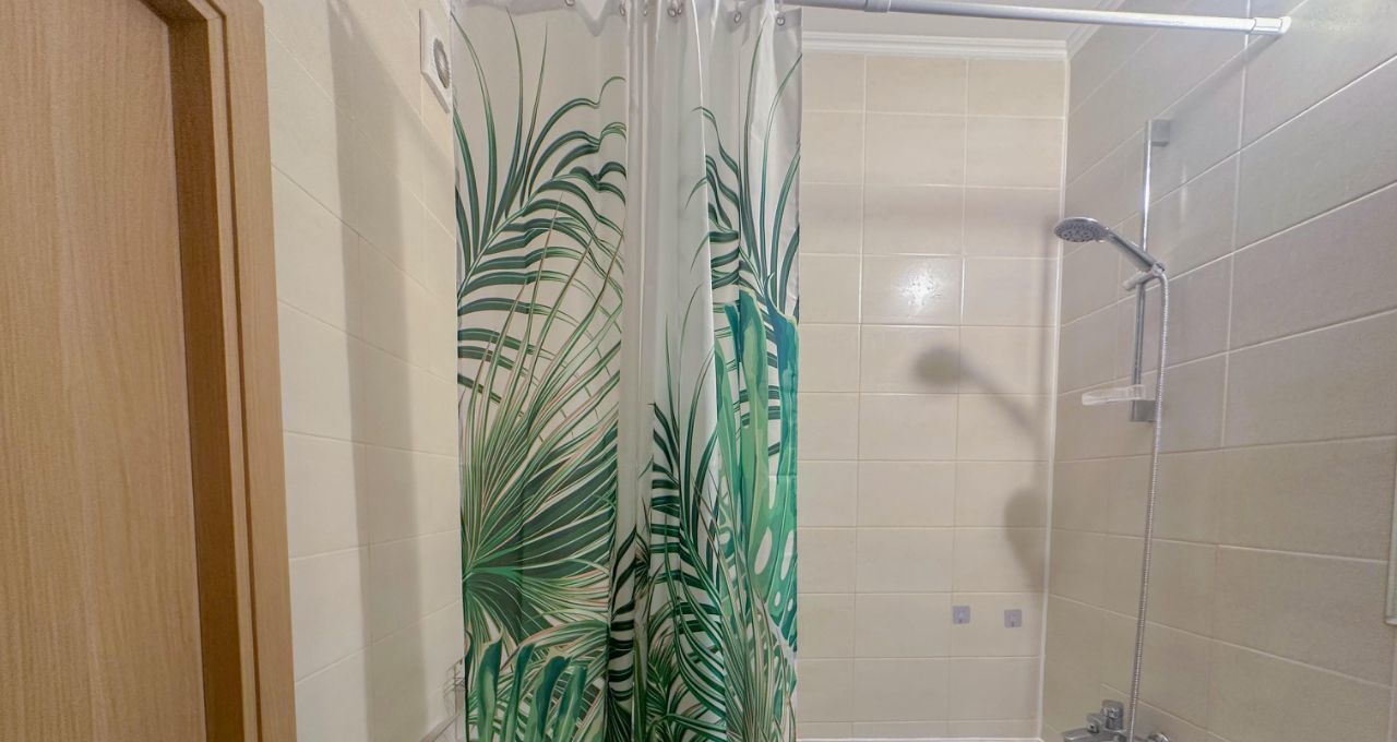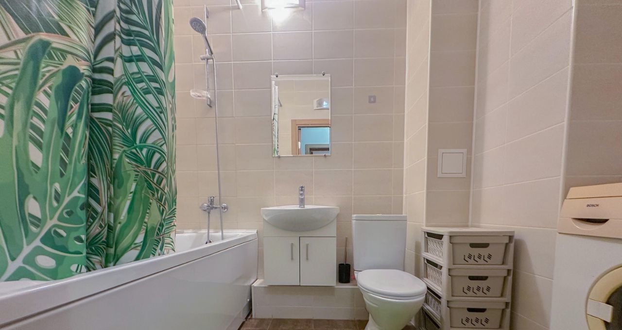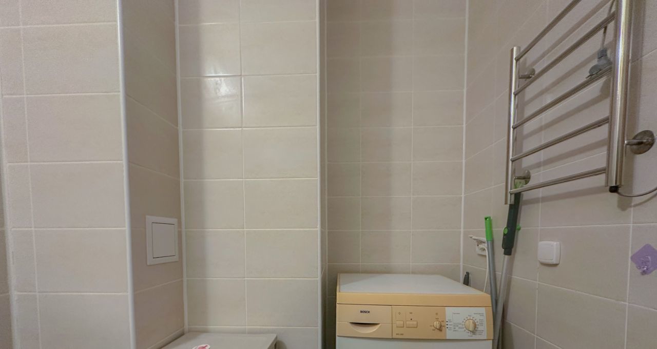 Совмещённый санузел оснащён всем необходимым, включая стиральную машину — забота о бытовых делах станет проще и быстрее.