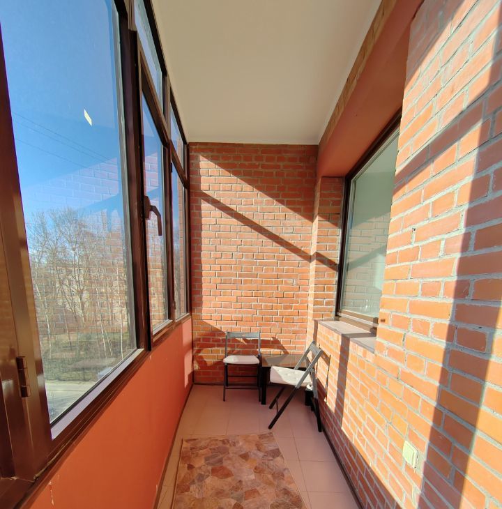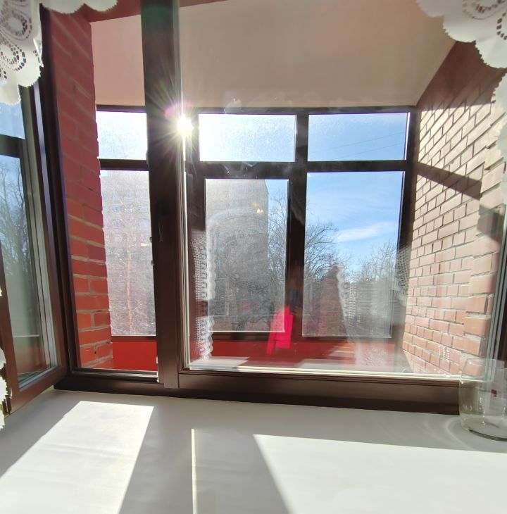 Застекленный балкон с видом на тихий зеленый двор.