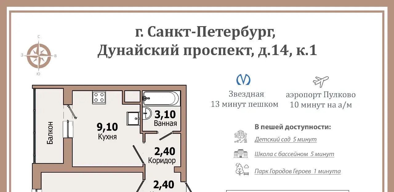 1-к кв. Санкт-Петербург Дунайский просп., 14к1 (33.2 м²)