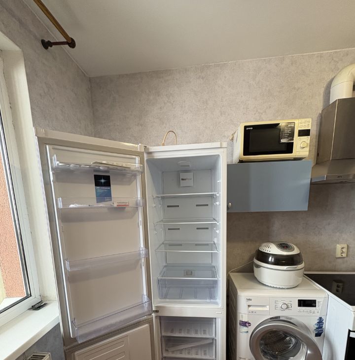 Кухня оборудована всем необходимым: холодильник, стиральная машина, микроволновая печь и духовой шкаф, вытяжка.