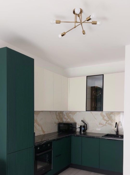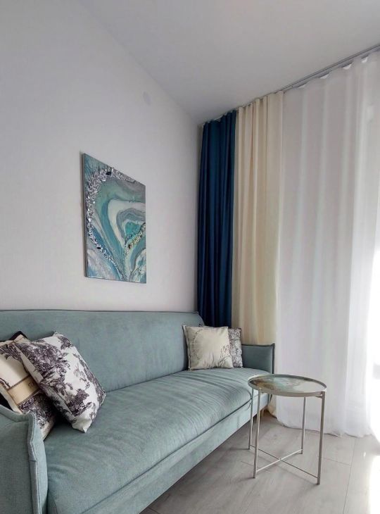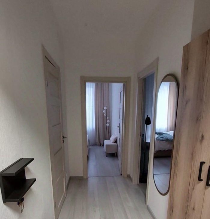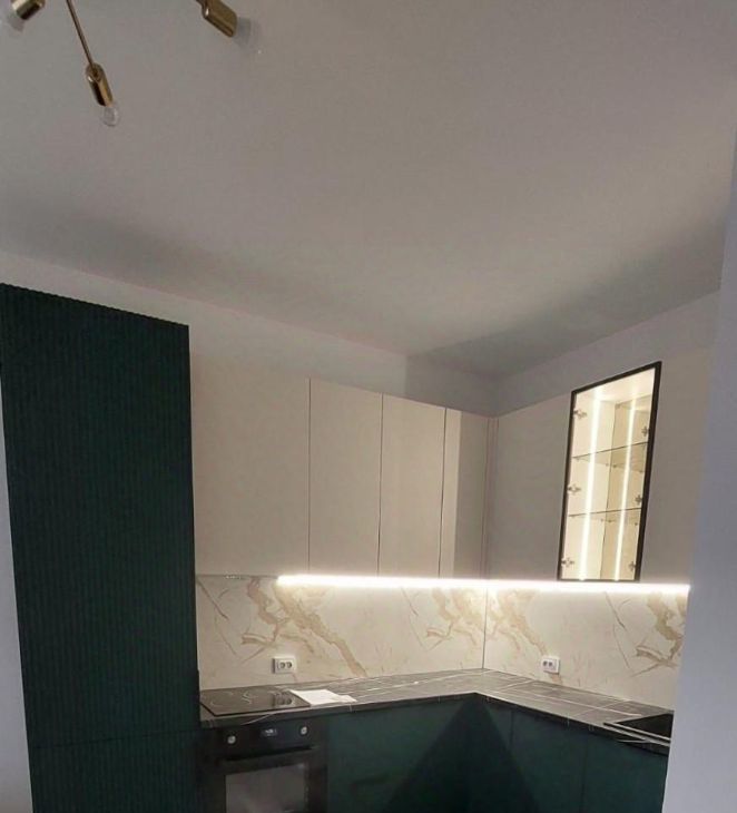 Вместительный кухонный гарнитур с сенсорной подсветкой вдоль всей рабочей поверхности, раскладной диван, двуспальная кровать с ортопедическим матрасом, просторный шкаф для хранения вещей в комнате и коридоре.