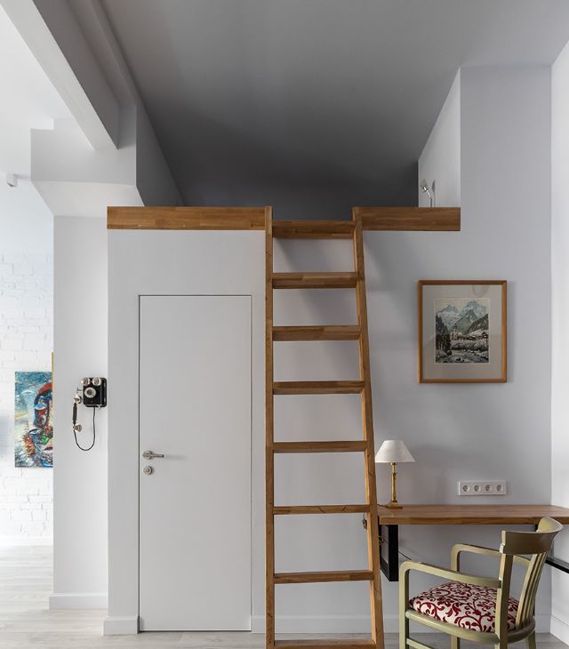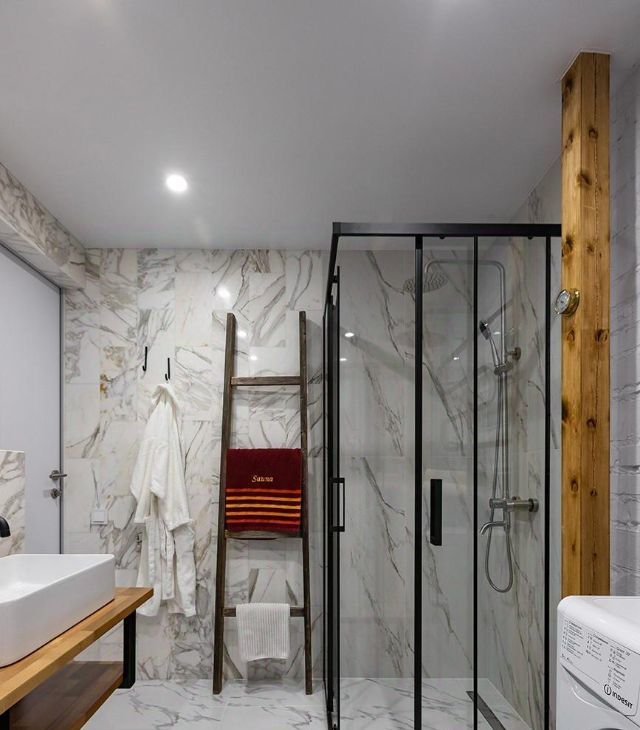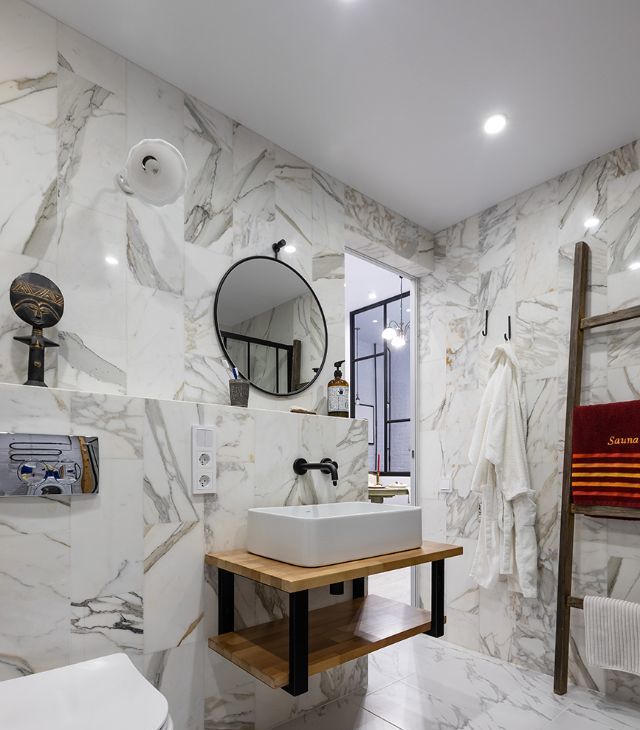 Ремонт квартиры выполнен с использованием только натуральных материалов: подоконники, столешницы, лестница, полки, перила на 2 ярус выполнены из дуба, стены в санузле -натуральный мрамор Calacatta.