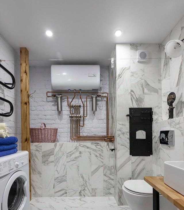 Просторная ванная комната оборудована стиральной машиной, фильтрами холодной и горячей воды, электронагревателем, душевой кабиной, мойкой, полотенцесушителем, зеркалом.