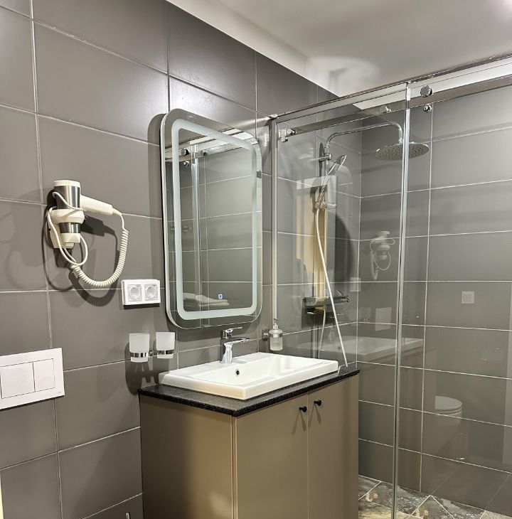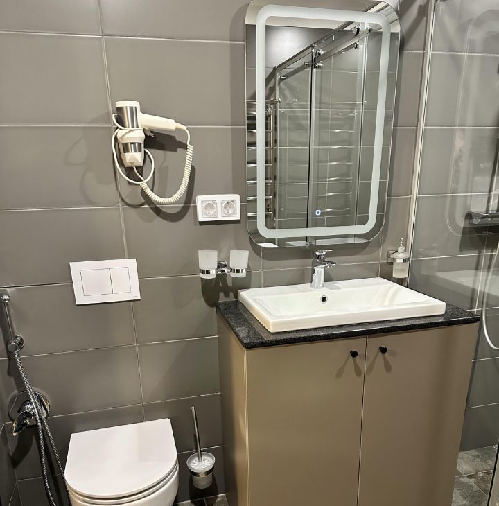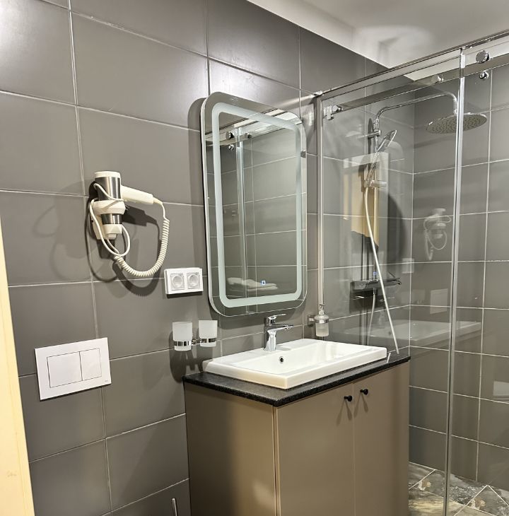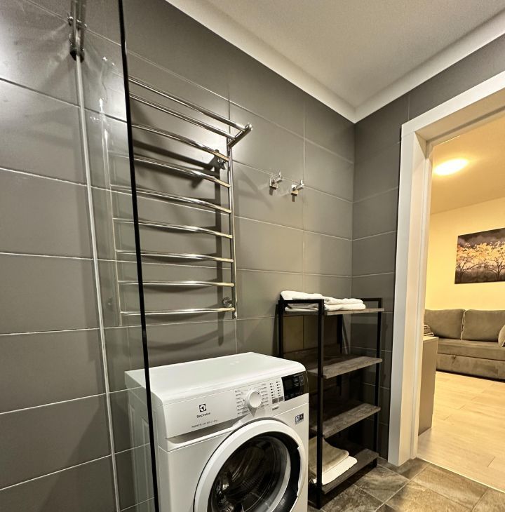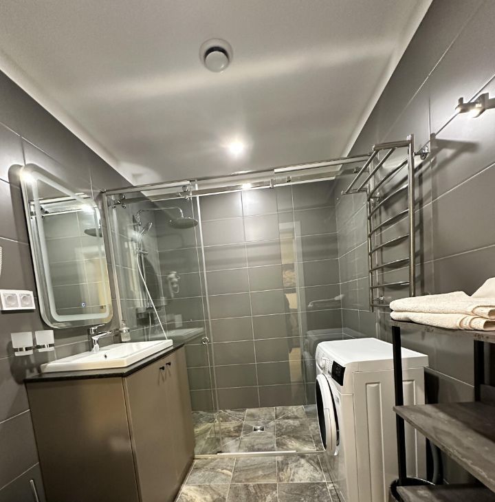 Квартира полностью меблирована: есть мебель как в комнате, так и на кухне. Ванная комната оснащена душевой кабиной, а на кухне установлена вся необходимая техника премиального уровня: кондиционер, холодильник, телевизор, посудомоечная и стиральная машины. Благодаря этому вы сможете сразу же почувствовать себя как дома и не беспокоиться о бытовых мелочах.