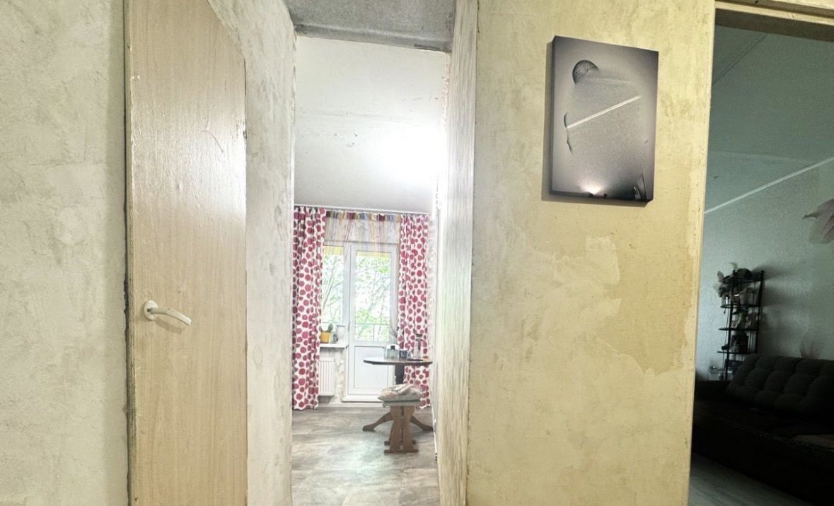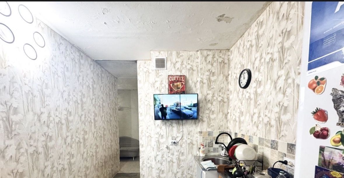 Комната нуждается в косметическом ремонте, не срочно, но со временем и по возможностям следует заняться потолком (есть дефекты побелки), переклеить обои. На окнах стеклопакеты. Пол в комнате ламинат, на кухне и в прихожей линолеум полукоммерческий.