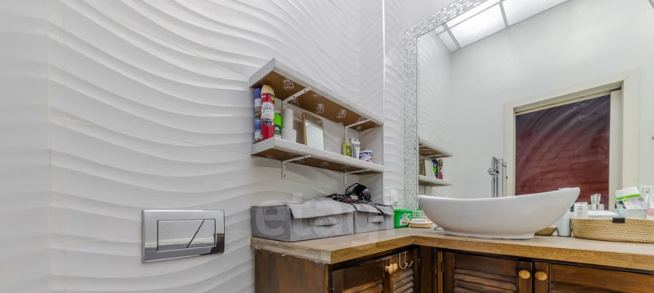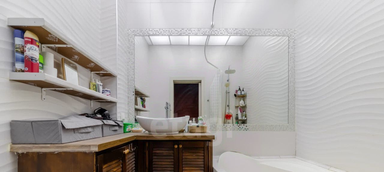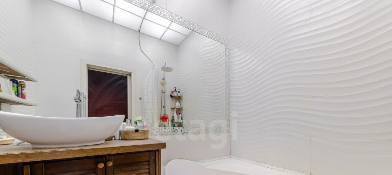 Совмещенный санузел с полупанорамным зеркалом,ваннной и тропическим душем.