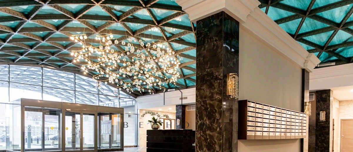 Панорамные окна в пол выходят в тихий зелёный двор, что создает комфортную и спокойную атмосферу.