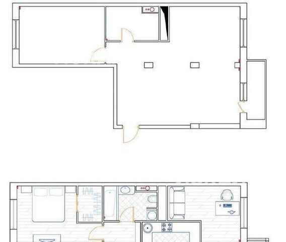 Формат евро-двушки: большая кухня-гостиная, где спокойно помещается зона отдыха и обеденный стол, и отдельная изолированная спальня.