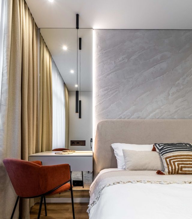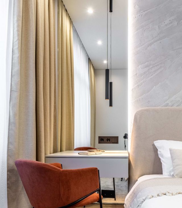 Дизайнерские стулья, стол, диван, кровать, встроеный шкаф в комнате, кресла, подобрано в цветовую гамму квартиры.