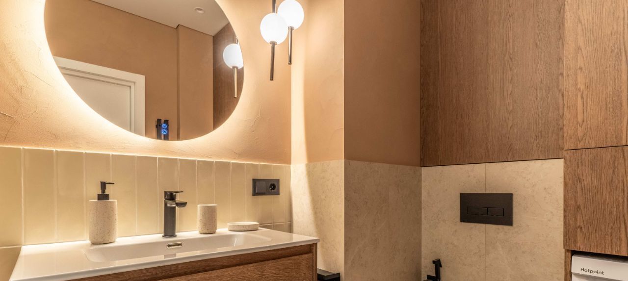 Просторная ванная комната . Ванная из льтевого мрамора. В ванной комнате мебель сделана под заказ. Встроенная стиральная машина. Душевая система, смесители, гиг душ, инсталляция от европейских производителей. Вся электрика и сантехника новая.