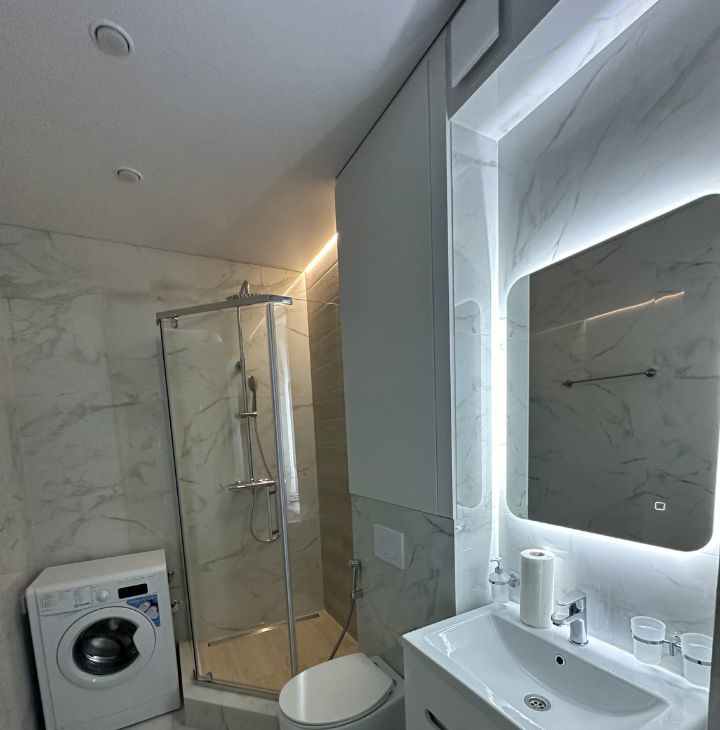 Ванная комната оснащена стиральной машиной, имеется водонагреватель в ванной, система инсталляции, Smart ТВ в комнатах и кухне.