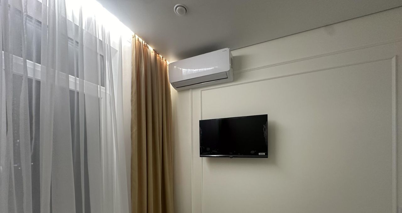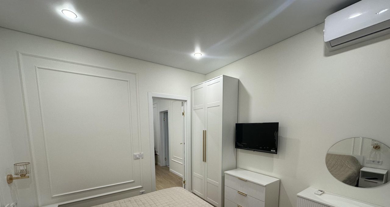 Имеется вместительная гардеробная, кондиционеры на кухне и спальне , сплит-система на балконе, встроенная техника: холодильник, посудомоечная машина, варочная поверхность, вытяжка, микроволновая печь, чайник.